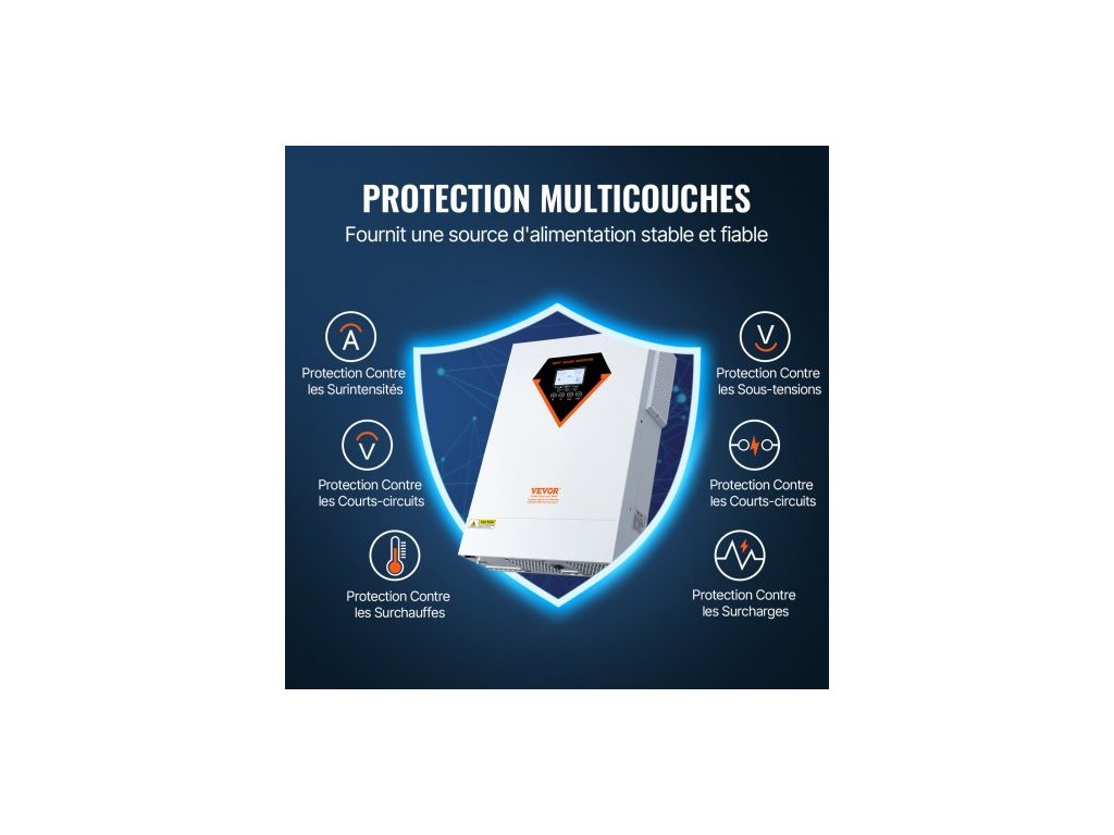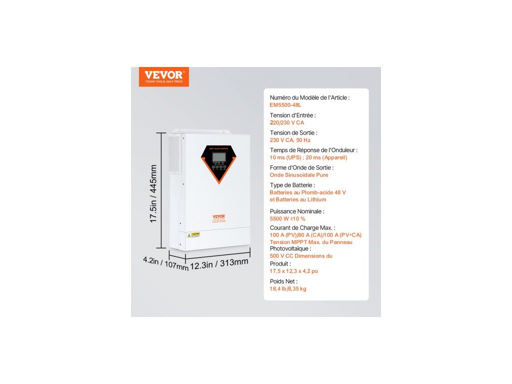 Číslo modelu položky: EM5500-48L, max. Napětí MPPT fotovoltaického pole: 500 V DC, Vstupní napětí: 220/230 V AC, Jmenovitý výkon: 5500 W ±10 %, Rozměry výrobku: 445 x 313 x 107 mm, Výstupní napětí: AC 230 V, 50 Hz, Typ baterie: 48 V olověné, lithiové a LiFePO baterie, Čistá hmotnost: 8,35 kg, Doba odezvy střídače: 10 ms (UPS); 20 ms (spotřebič), Výstupní tvar vlny: Čistá sinusová vlna, Max. nabíjecí proud: 100 A (FV) / 80 A (AC) / 100 A (FV+AC)
