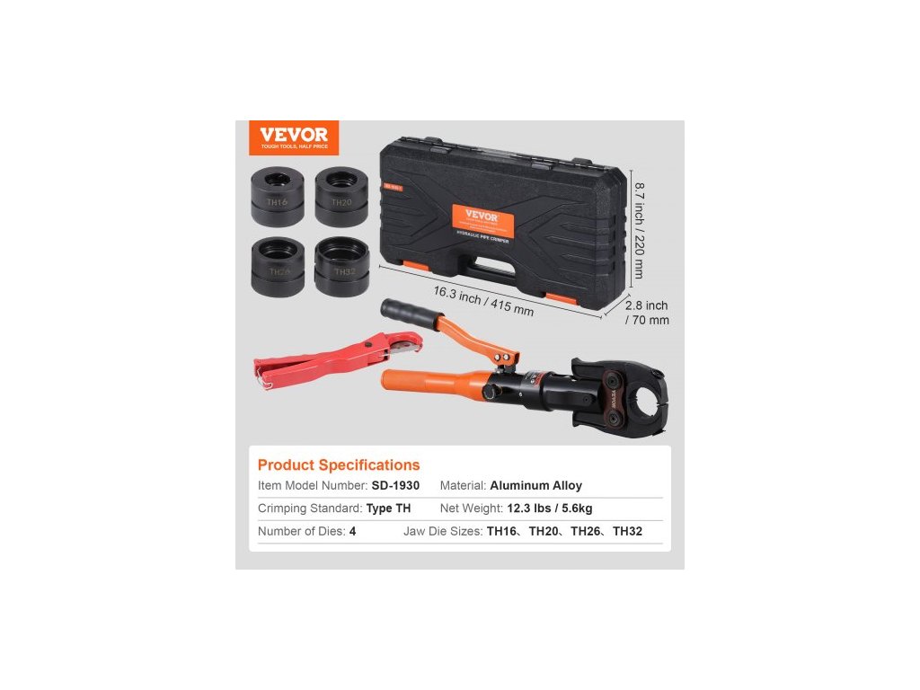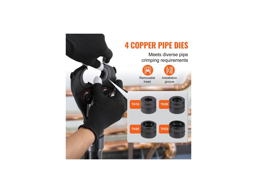 Hydraulický krimpovací nástroj na měděné tvarovky, lisovací kleště s rychlovýměnnými čelistmi TH16, TH20, TH26, TH32, lisovací sada otočná o 360° pro stísněné prostory, T-kusy s hydraulickým pohonemKompatibilita multifunkčních matric