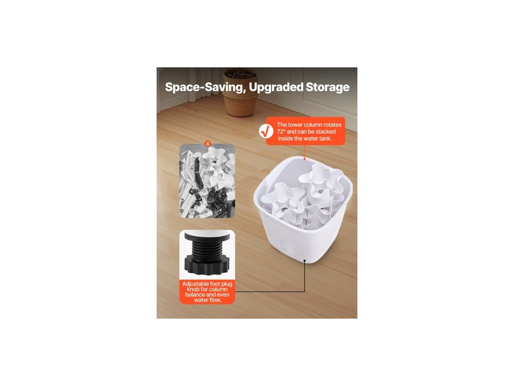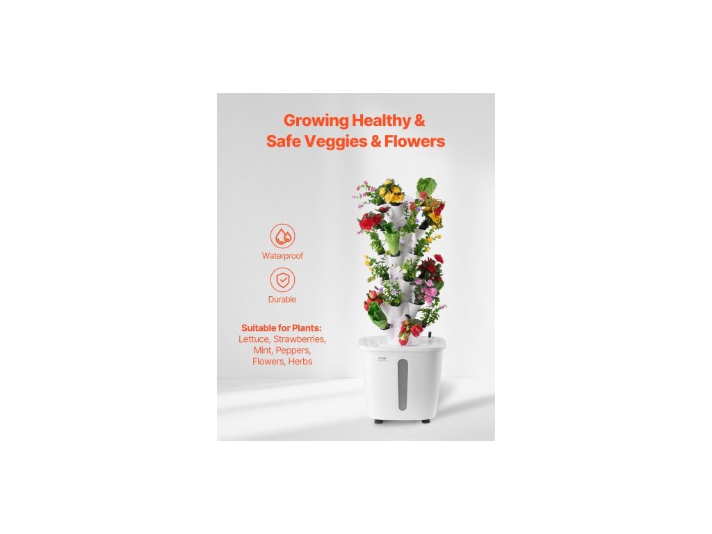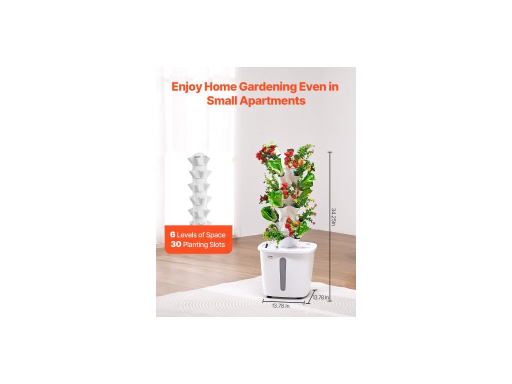 Počet vrstev: 6,Hlavní materiály: ABS, PP,Včetně pěstebního světla: Ne,Objem nádrže na vodu: 20 l,Kolečka: Ne,Barva: Bílá,Číslo modelu položky: VV1-6C-EU,Hmotnost výrobku: 7,5 lbs / 3,4 kg,Rozměry: 13,78 x 13,78 x 34,25 palce / 350 x 350 x 870 mm,Počet výsadbových slotů: 30