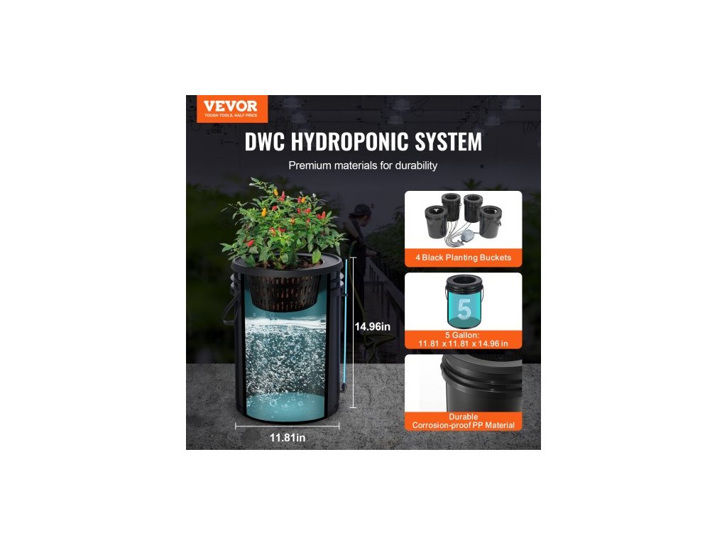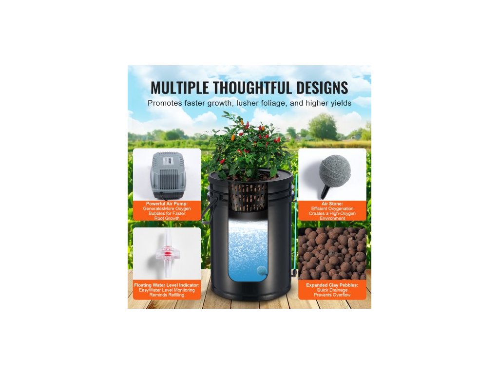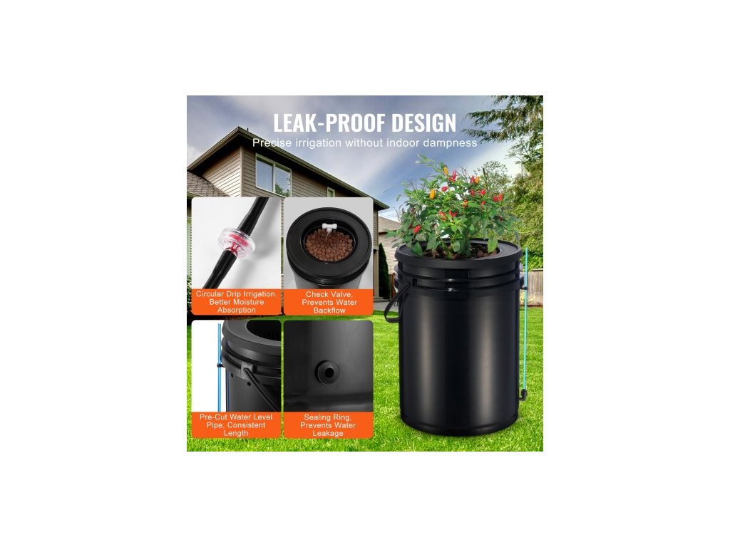 Hydroponický pěstební systém DWC, hydroponický pěstební systém s horní sadou pro zavlažování, hlubokomořská kultura o objemu 5 galonů, 4 kbelíky, s vzduchovým čerpadlem, vzduchovými kameny a zařízením na kontrolu hladiny vody pro listovou zeleninu5-galónový hydroponický systém DWC