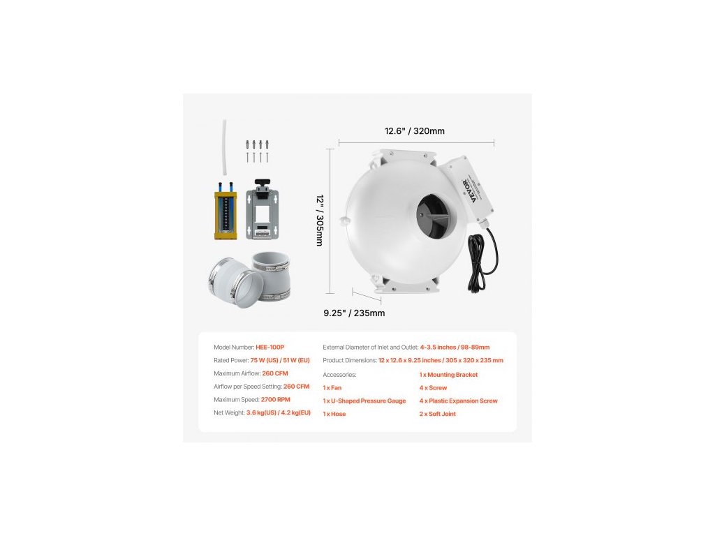 Maximální rychlost: 2700 ot./min,Číslo modelu položky: HEE-100P,Průtok vzduchu na nastavení rychlosti: 260 CFM,Jmenovitý výkon: 75 W (USA) / 51 W (EU),Maximální průtok vzduchu: 260 CFM,Rozměry produktu: 12 x 12,6 x 9,25 palce / 305 x 320 x 235 mm,Vnější průměr vstupu a výstupu: 4-3,5 palce / 98-89 mm,Čistá hmotnost: 7,9 3,6 kg (USA), 4,2 kg (EU)