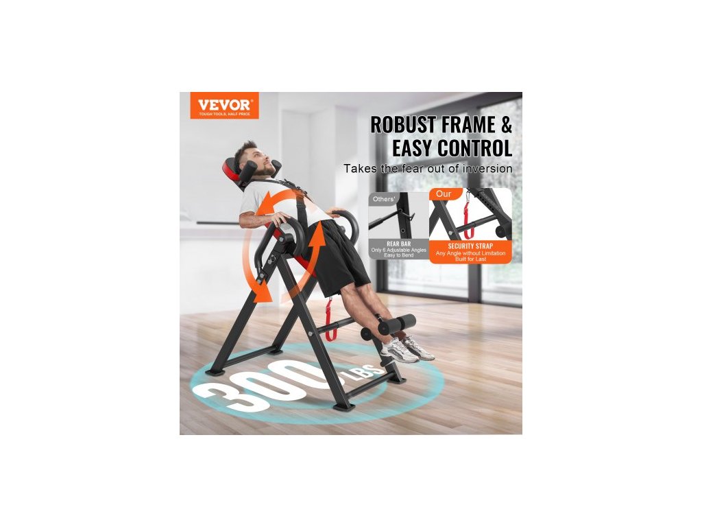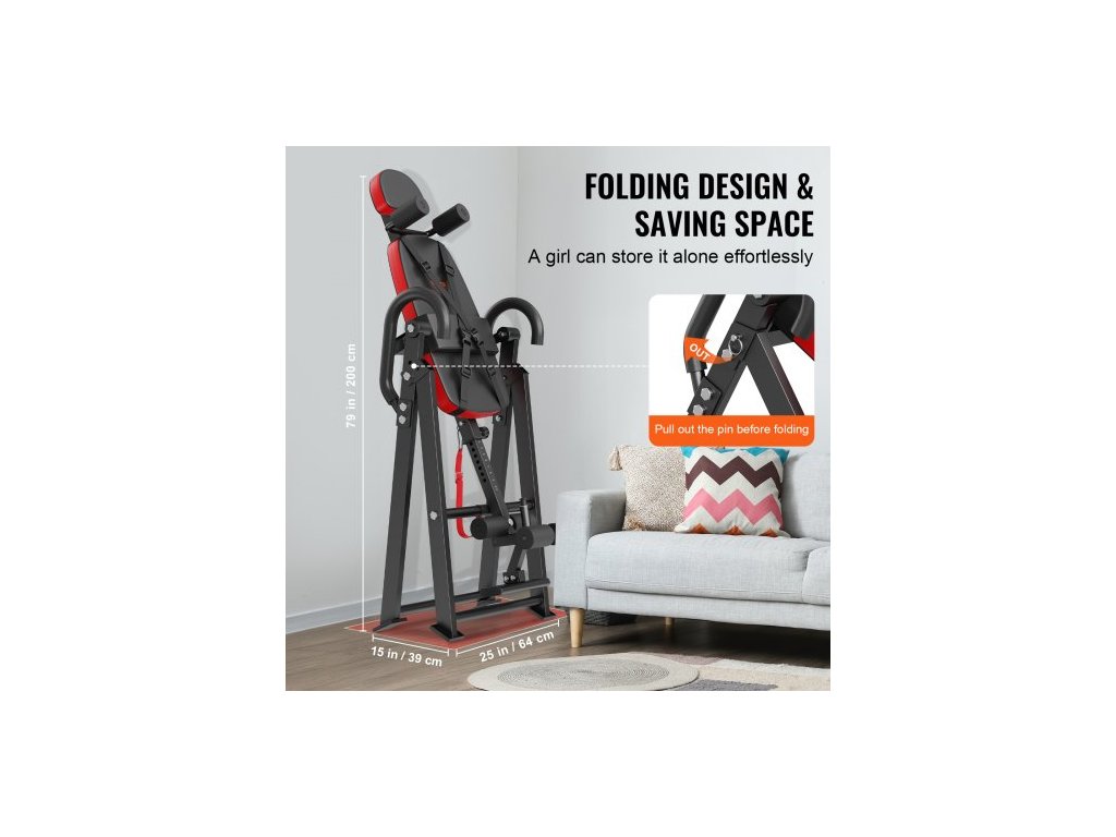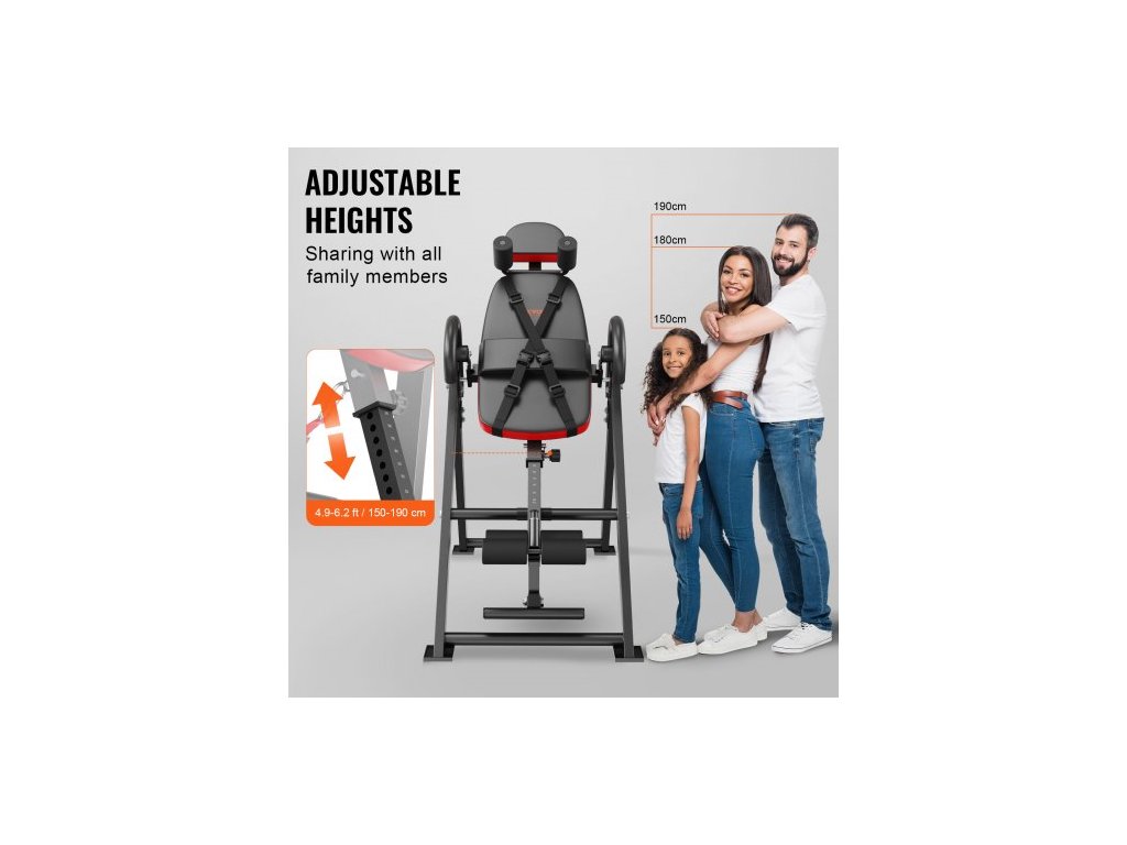 Inverzní stůl , nosnost 136 kg, těžký inverzní stůl, dekompresní zádový repetirní stroj, posilovací zařízení s opěrkou hlavy, aretace kotníku, nastavitelný ochranný pás, červená/černá