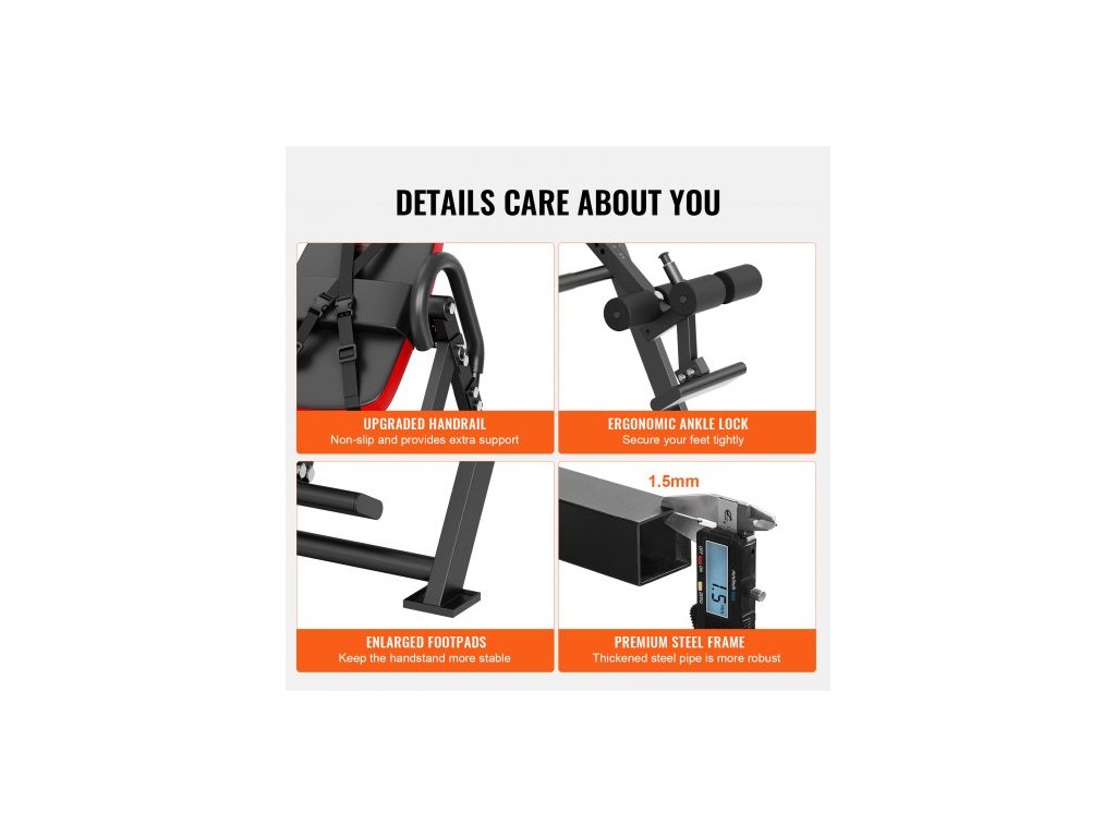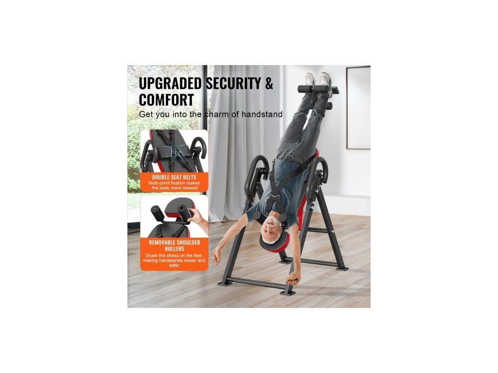 Inverzní stůl , nosnost 136 kg, vysoce odolný inverzní stůl, dekompresní zádový repetirní stroj, silový tréninkový stroj s opěrkou hlavy, aretace kotníků, nastavitelný ochranný pás, červená/černáNosnost 136 kg