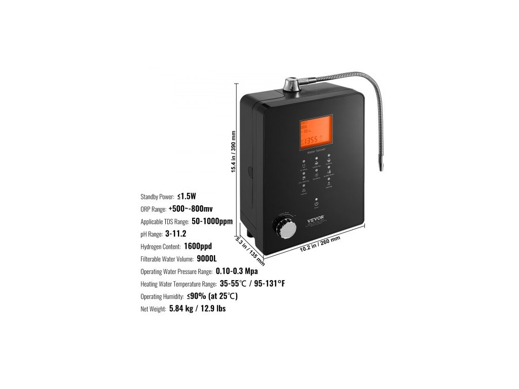 Použitelný rozsah TDS: 50-1000ppm, Obsah vodíku: 1600ppd, Rozsah teploty topné vody: 35-55℃ / 95-131°F, Provozní vlhkost: ≤90% (při 25℃), Pohotovostní výkon: ≤1,5W, Rozsah pH: 3-11,2, Rozsah ORP: +500~-800mV, Objem filtrovatelné vody: 9000L, Číslo modelu položky: EHM-939, Provozní tlak vody: 0,1-0,3 MPa, Čistá hmotnost: 5,84 kg / 12,9 lbs