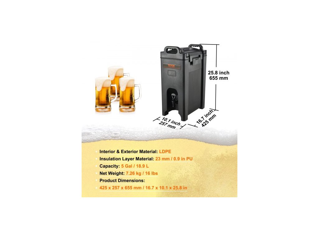 Objem: 5 galonů / 18,9 l,Číslo modelu: 5GL,Materiál izolační vrstvy: 23 mm / 0,9 palce PU,Rozměry výrobku: 425 x 257 x 655 mm / 16,7 x 10,1 x 25,8 palce,Čistá hmotnost: 7,26 kg / 16 liber,Vnitřní a vnější materiál: LDPE