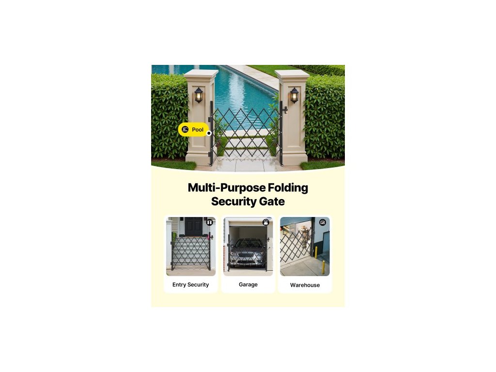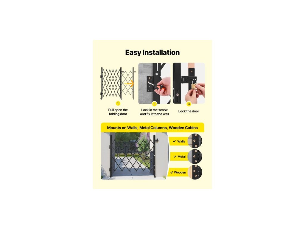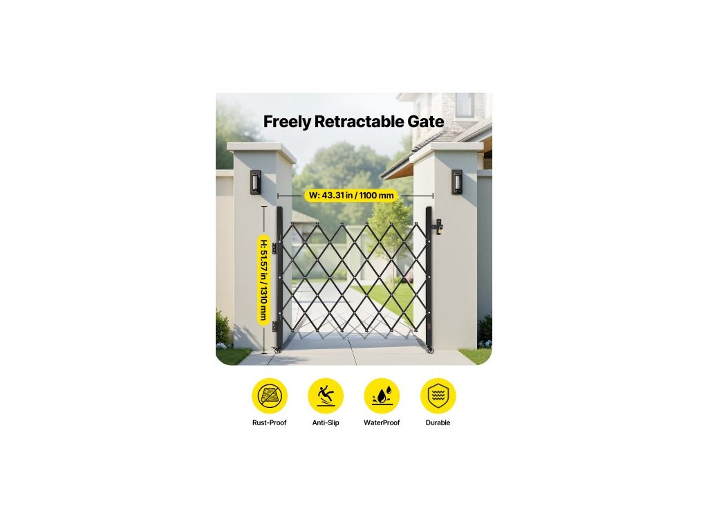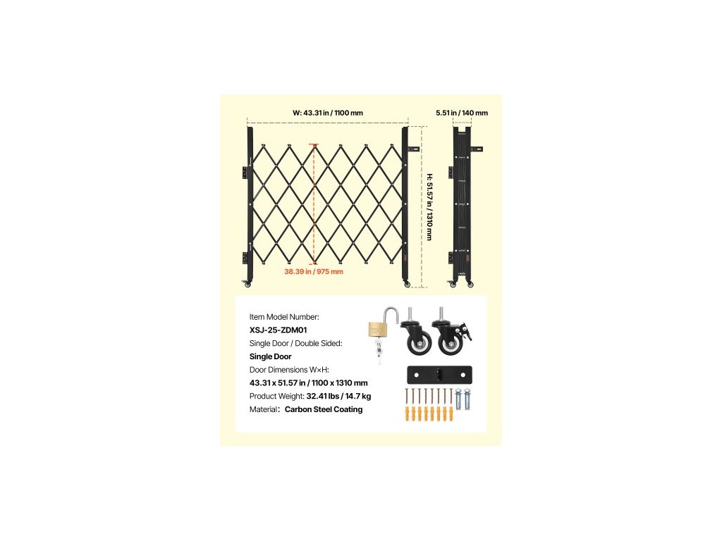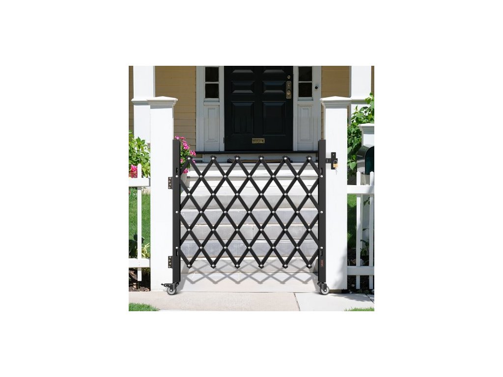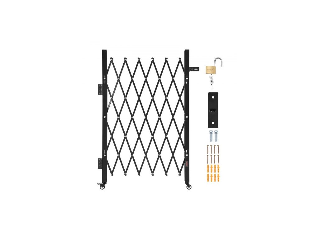 Jednoduchá skládací bezpečnostní brána, uzamykatelná nůžková brána s otočnými kolečky o 360°, venkovní ocelová zatahovací brána s barikádou, pro zabezpečení vstupu, garáže, skladu a bazénu, 110 × 131 cm (Š × V)