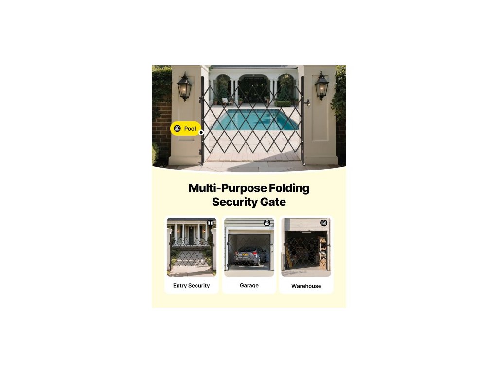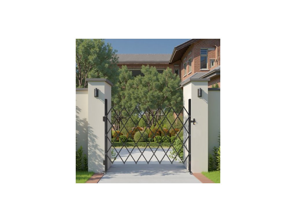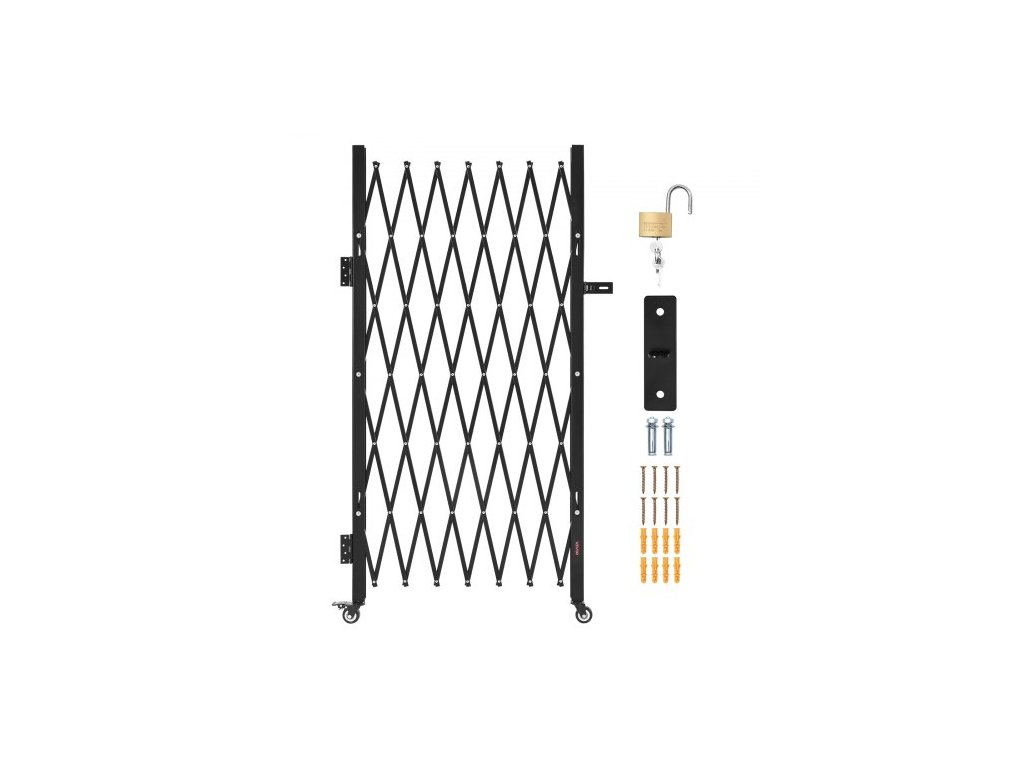 Jednoduchá skládací bezpečnostní brána, uzamykatelná nůžková brána s otočnými kolečky o 360°, venkovní ocelová zatahovací brána s barikádou, pro zabezpečení vstupu, garáže, skladu a bazénu, 180 × 161 cm (Š × V)