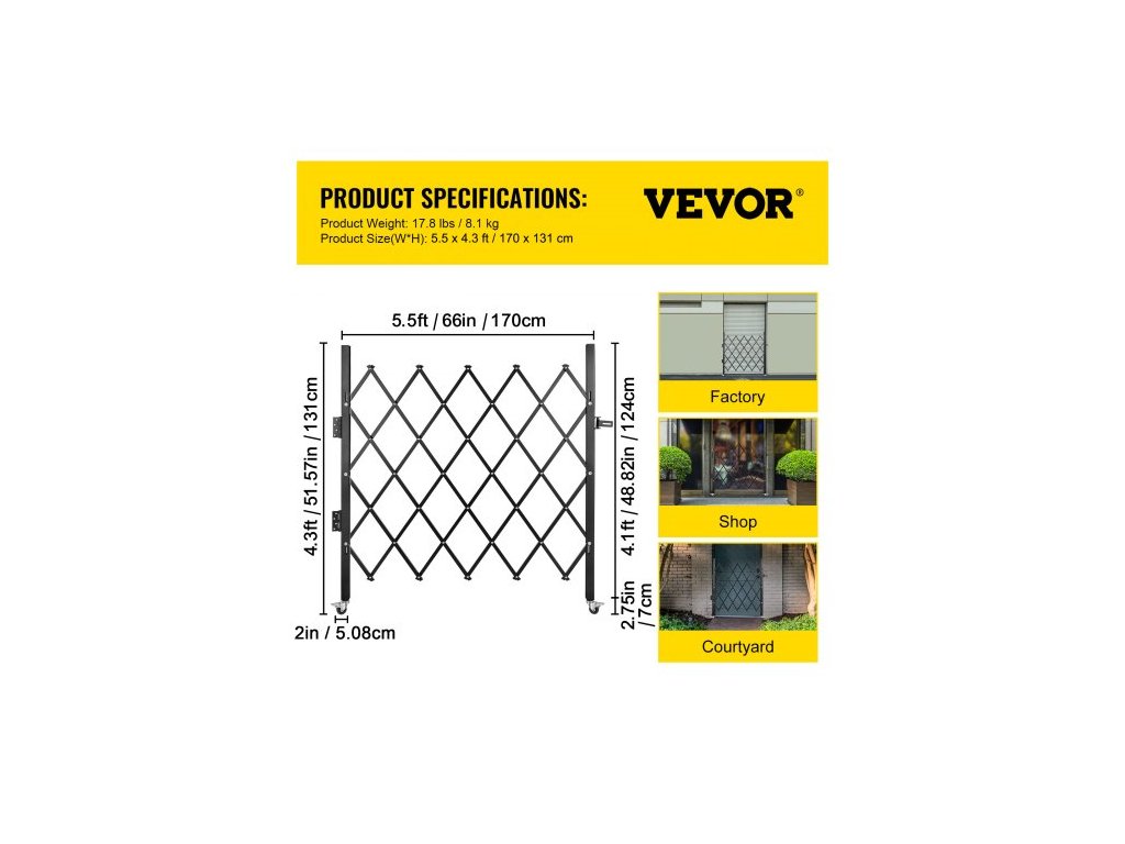 Jednoduchá skládací bezpečnostní brána, 170 × 124 cm (Š × V), Skládací brána, Ocelová harmoniková bezpečnostní brána, Flexibilní rozšiřující se bezpečnostní brána, 360° rolovací barikádová brána, nůžková brána nebo dveře s visacím zámkemRozšiřitelná šířka 5-1/2 stop