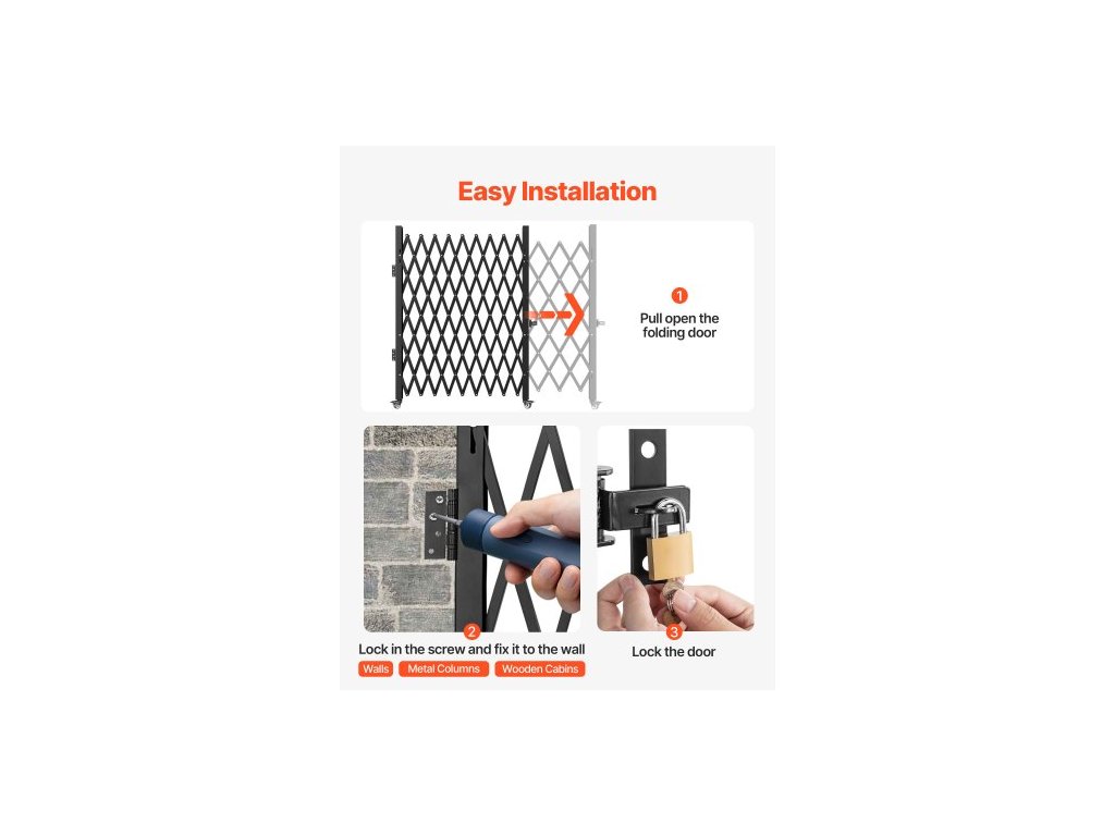 Rozměry ve složeném stavu (V x Š): 85 x 4 palce/7,1 x 0,3 stopy,Barva: Černá,Materiál: 3/4" ocel o tloušťce 14 Gauge,Typ dveří: Jednoduchá skládací vrata,Rozměry ve složeném stavu (V x Š): 85 x 95 palců/7,1 x 7,9 stopy,Hmotnost položky: 33,5 lbs/15,2 kg,Povrch: Práškový povrch