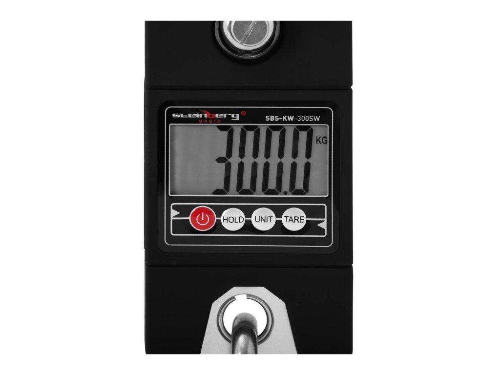 Jeřábová váha SBS-KW-300SW Steinberg BASIC je přesně měřící a spolehlivý nástroj pro průmyslovou a řemeslnou oblast, myslivost, nebo lesnictví. Váha je vyrobena z odolného a nerozbitného ABS plastu, třmen a S-hák z ušlechtilé oceli. Měřicí rozsah jeřábové váhy je maximálně 300 kilogramů a přesnost 100 g. Přitom může být měrná hodnota zobrazena v kilogramech, librách nebo newtonech. Jeřábová váha SBS-KW-300SW má vysoké rozlišení LCD displeje s přepínatelným podsvícením, takže naměřené hodnoty lze číst i za nepříznivých světelných podmínek. V případě, že je rozsah měření překročen, nebo je-li baterie téměř vybitá, zobrazí se zpráva na displeji. V případě 60 sekundové neaktivity se displej automaticky vypne.Doplňkové parametry