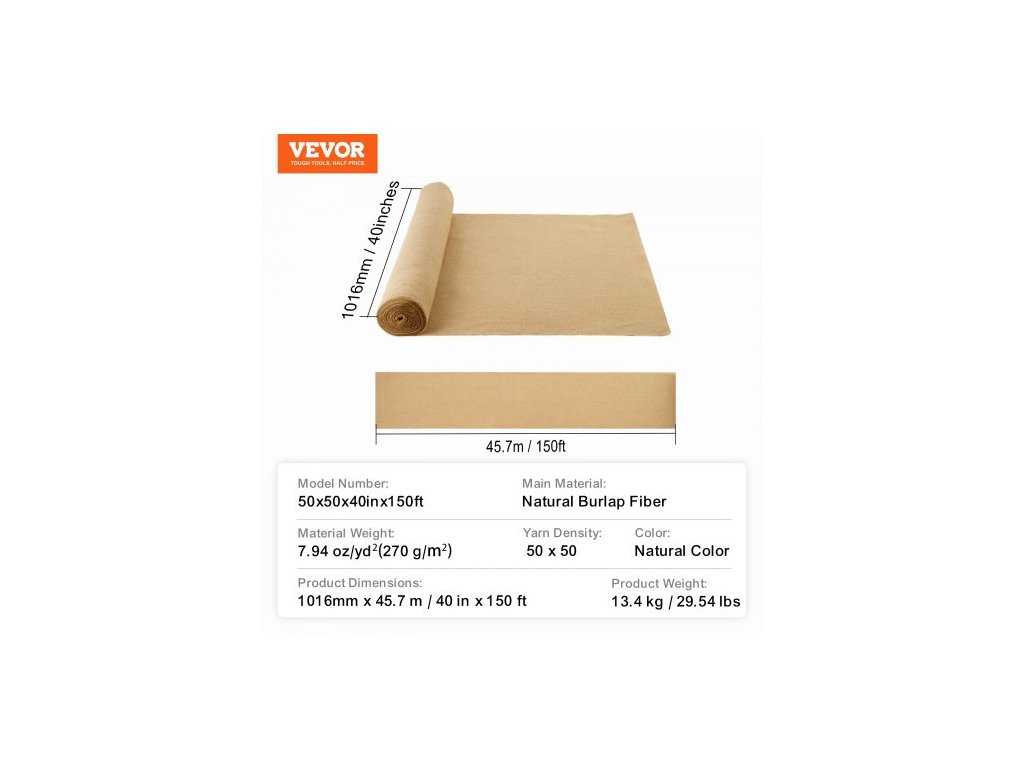 Barva: Přírodní barva, Číslo modelu položky: 50x50x40inx150ft, Hmotnost výrobku: 13,4 kg / 29,54 lbs, Rozměry výrobku: 40 in x 150 ft / 1016 mm x 45,7 m, Hustota příze: 50 x 50, Hlavní materiál: Přírodní jutové vlákno, Hmotnost materiálu: 7,94 oz/yd² (270 g/㎡)