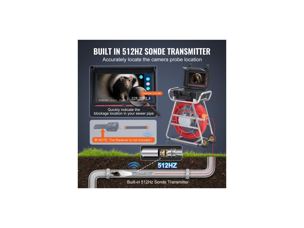 Kanalizační kamera , 100 m, samonivelační kamera do odpadu s 10,1" dotykovou obrazovkou, vysílačem 512 Hz a počítadlem vzdálenosti, instalatérská kamera IP67 s osvětlením - 12 LED, 32GB karta pro potrubíPřesné a efektivní vyhledávání
