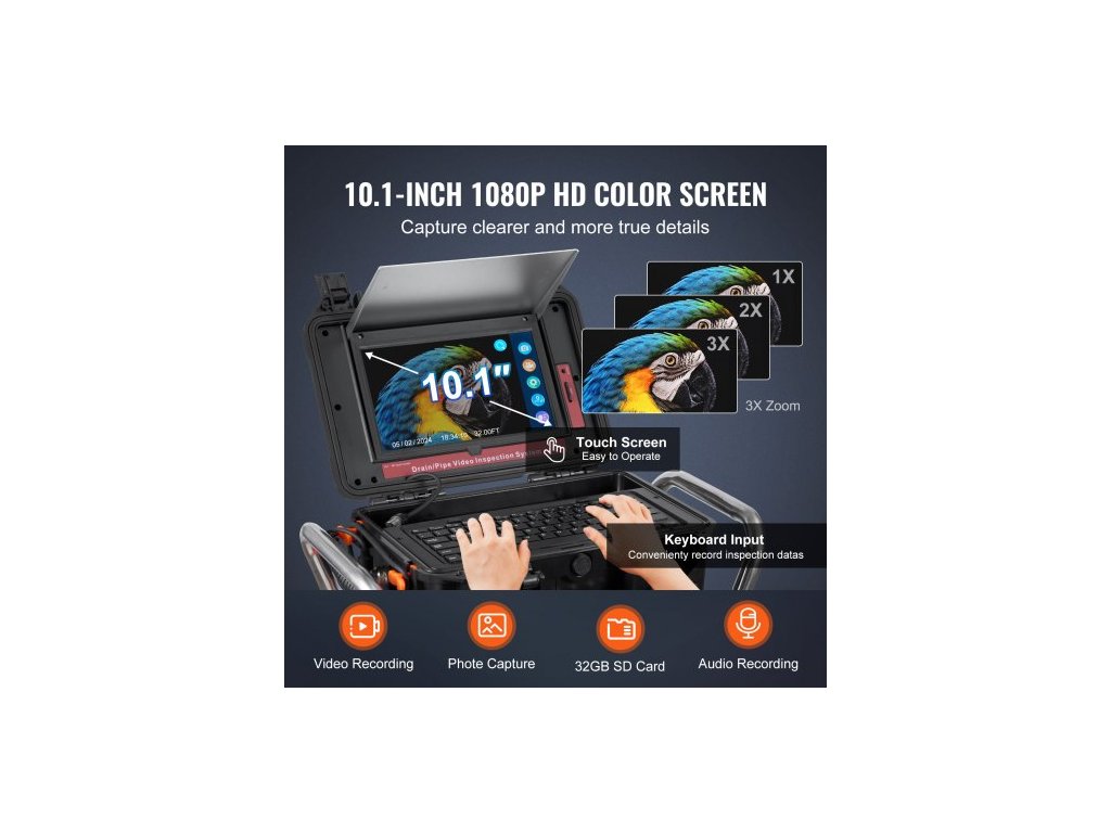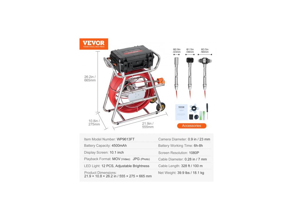Rozlišení obrazovky: 1080P,Kapacita baterie: 4500 mAh,LED světlo: 12 ks,Nastavitelný jas,Úhlopříčka displeje: 10,1 palce,Číslo modelu položky: WP9613FT,Průměr kabelu: 7 mm,Délka kabelu: 100 m,Průměr kamery: 23 palce mm, Formát přehrávání: MOV (Video) JPG (Fotografie), Materiál pouzdra: ABS pouzdro, Rozměry produktu: 21,9 × 10,8 × 26,2 palce / 555 × 275 × 665 mm, Čistá hmotnost: 39,9 lbs / 18,1 kg