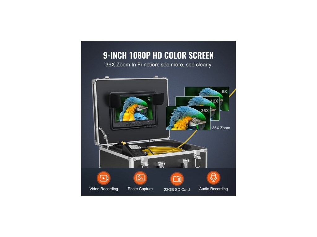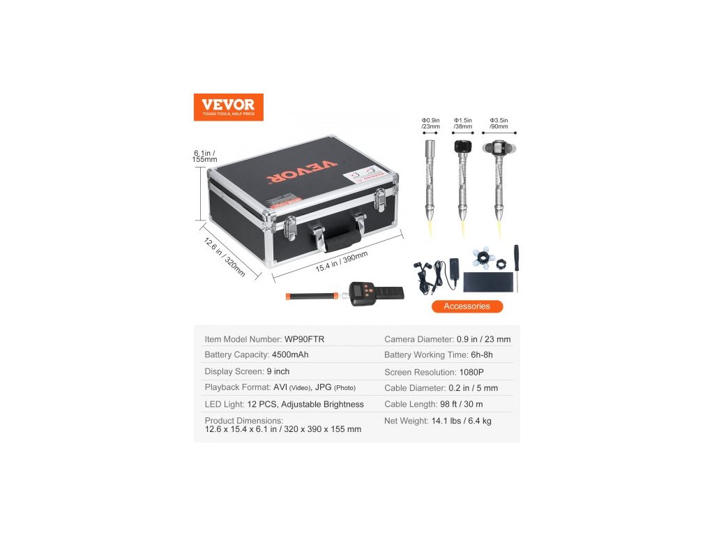 Rozlišení obrazovky: 1080P, LED světlo: 12 ks, nastavitelný jas, Úhlopříčka displeje: 9 palců, Průměr kamery: 0,9 palce / 23 mm, Rozměry produktu: 12,6 x 15,4 x 6,1 palce / 320 x 390 x 155 mm, Kapacita baterie: 4500 mAh, Číslo modelu položky: WP90FTR, Průměr kabelu: 0,2 palce / 5 mm, Délka kabelu: 98 stop / 30 m, Formát přehrávání: AVI (video), JPG (Fotografie),Materiál pouzdra: Hliníkové pouzdro,Čistá hmotnost: 6,4 kg,Rozměry přijímače: 535 x 120 x 50 mm