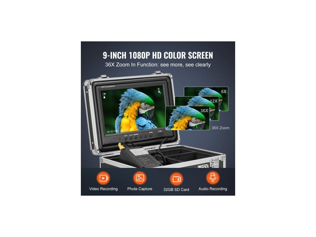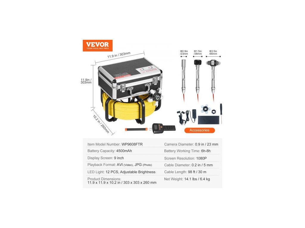 Rozlišení obrazovky: 1080P, LED světlo: 12 ks, nastavitelný jas, Displej: 9 palců, Průměr kamery: 0,9 palce / 23 mm, Rozměry produktu: 11,9 x 11,9 x 10,2 palce / 303 x 303 x 260 mm, Kapacita baterie: 4500 mAh, Číslo modelu položky: WP9608FTR, Průměr kabelu: 5 mm, Délka kabelu: 30 m, Formát přehrávání: AVI (Video), JPG (Fotografie), Materiál pouzdra: Hliníkové pouzdro, Čistá hmotnost: 6,4 kg, Rozměry přijímače: 535 x 120 x 50 mm