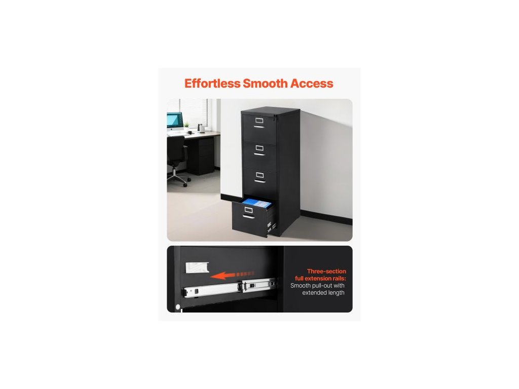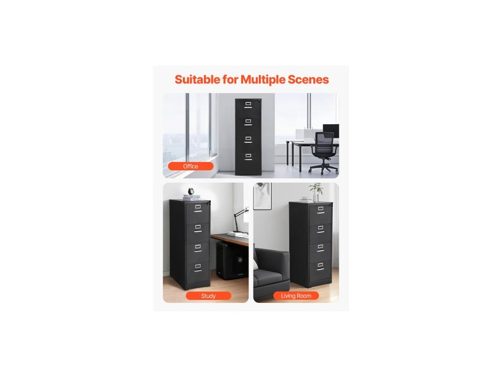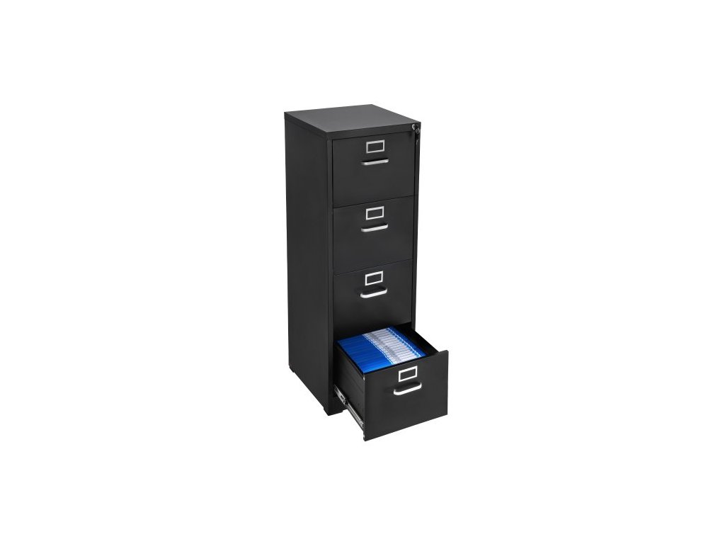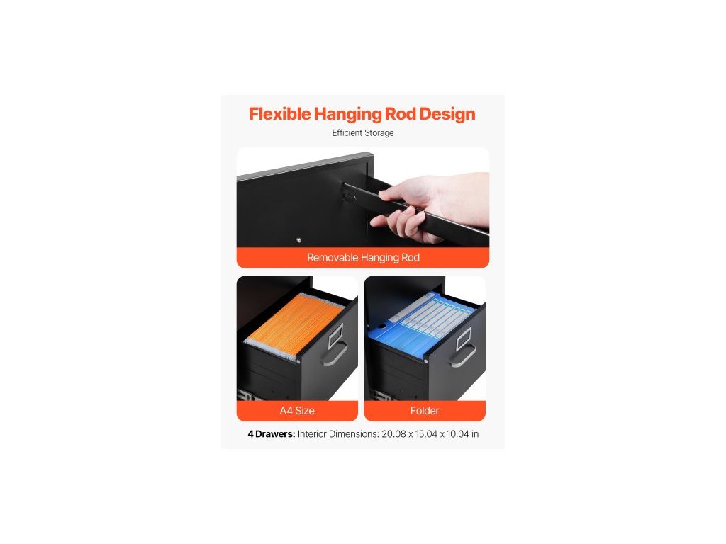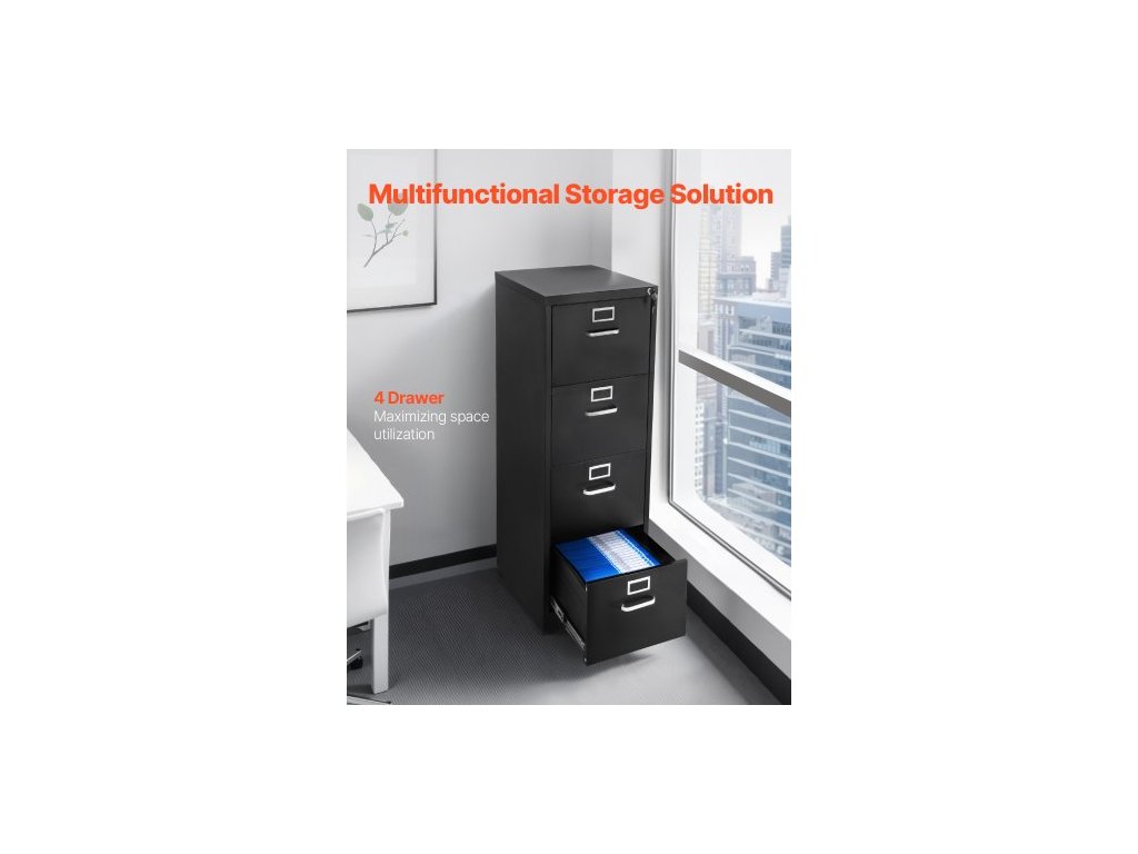Kartotéka se 4 zásuvkami a zámkem, kovové vertikální kartotéky pro domácí kancelář, odolná skříň s odnímatelnou závěsnou tyčí, pro kartotéky formátu A4/Letter/Legal, snadná montáž (černá)Prostorný úložný prostor