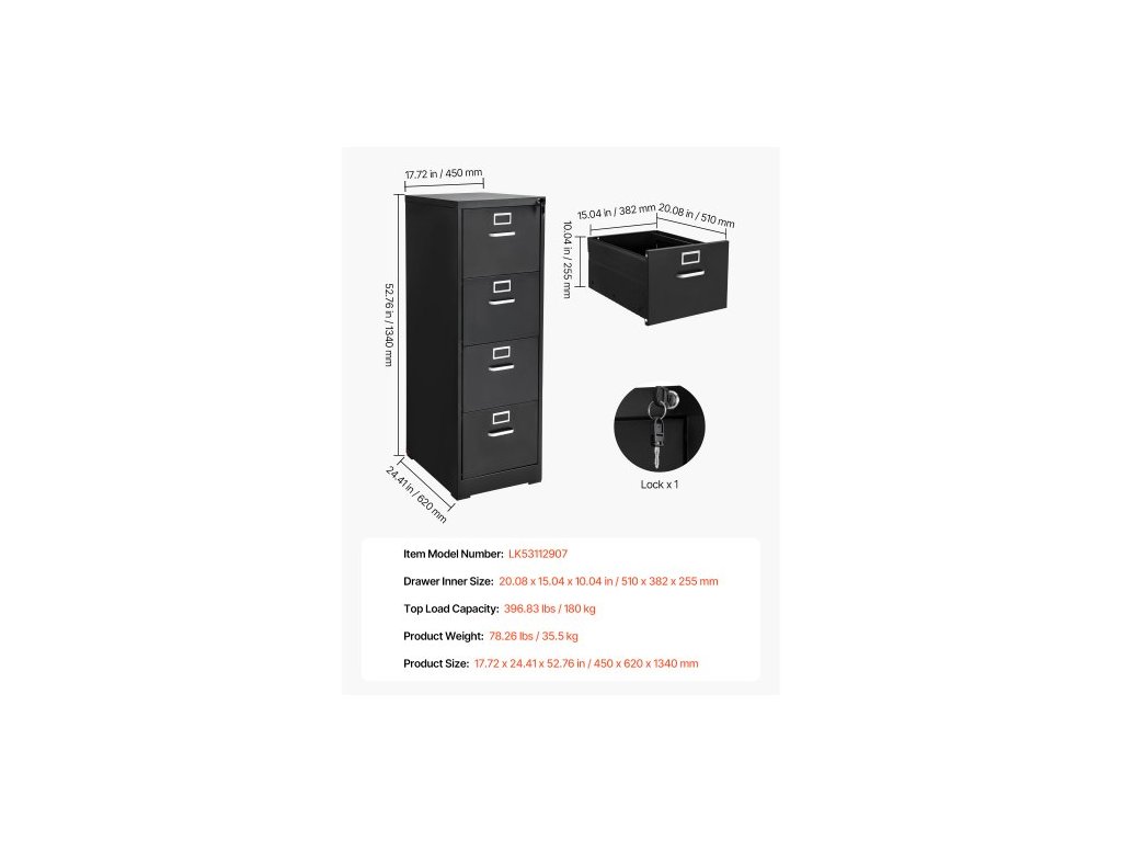 Číslo modelu položky: LK53112907,Hmotnost výrobku: 78,26 lbs / 35,5 kg,Horní nosnost: 396,83 lbs / 180 kg,Vnitřní rozměry zásuvky: 20,08 x 15,04 x 10,04 palce / 510 x 382 x 255 mm,Rozměry výrobku: 17,72 x 24,41 x 52,76 palce / 450 x 620 x 1340 mm