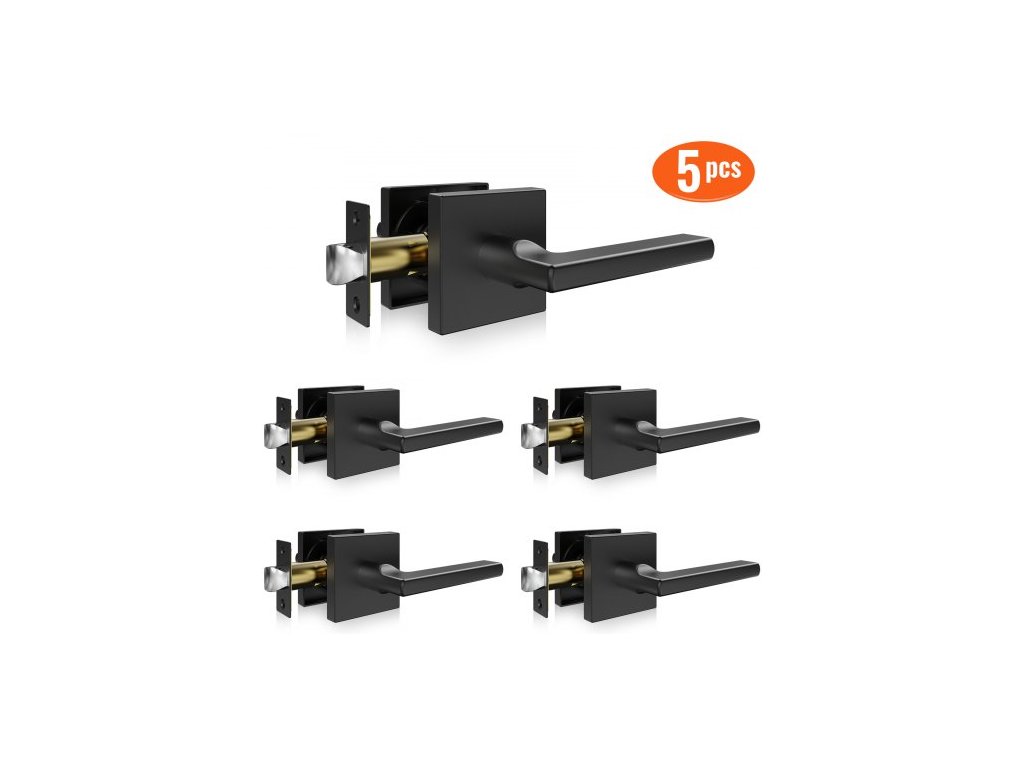 klika na průchozí dveře, sada 5 matně černých klik, levá nebo pravá otočná páka, bez aretace, otočení o 45° pro otevření, hranaté vnitřní kliky pro chodby, šatny, zasedací prostoryJednoduchost bez klíče