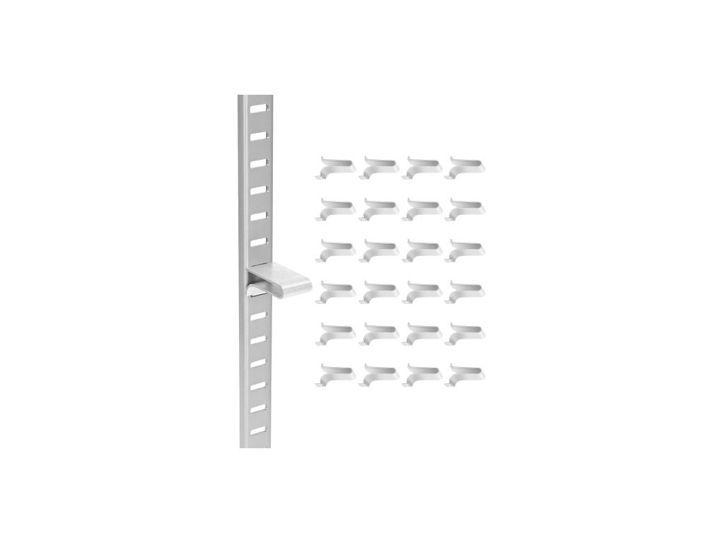 Tloušťka: 1 mm, Množství klipů na police: 40 ks, Barva: Pozinkovaná, Číslo modelu položky: GJ01, Směr drážky: Horizontální, Materiál: SPCC se zinkovým povlakem, Rozměry výrobku: 17 x 22,3 x 40 mm, Čistá hmotnost: 0,44 kg