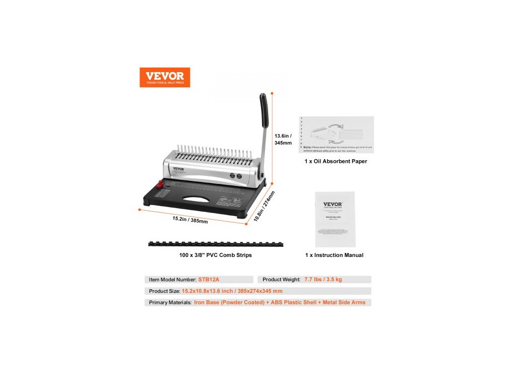 Hlavní materiály: Železná základna (s práškovým nástřikem) + plášť z ABS plastu + kovové boční ramena, Číslo modelu položky: STB12A, Hmotnost výrobku: 7,7 lbs/3,5 kg, Rozměry výrobku: 15,2x10,8x13,6 palce/385x274x345 mm