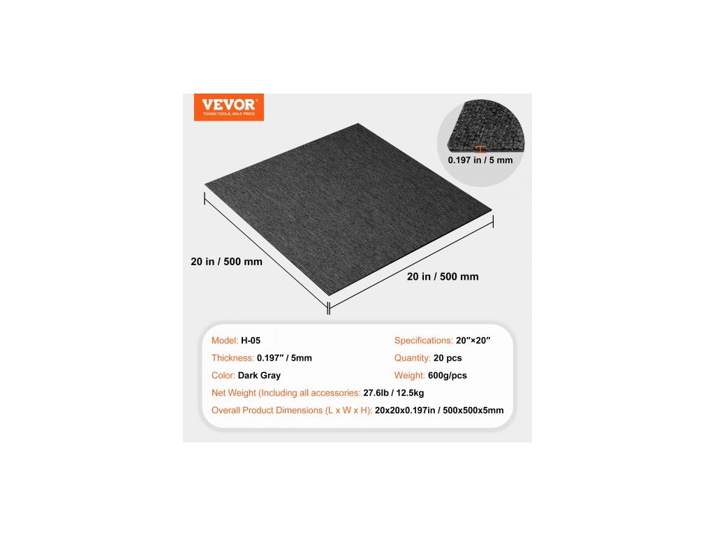 Tloušťka: 0,197” / 5 mm,Specifikace: 20x20”,Barva: tmavě šedá,Celkové rozměry výrobku (D x Š x V): 20x20x0,197 palce / 500x500x5 mm,Model: H-05,Množství: 20 ks,Hmotnost: 600 g/m²,Čistá hmotnost (včetně veškerého příslušenství): 27,6 lb / 12,5 kg