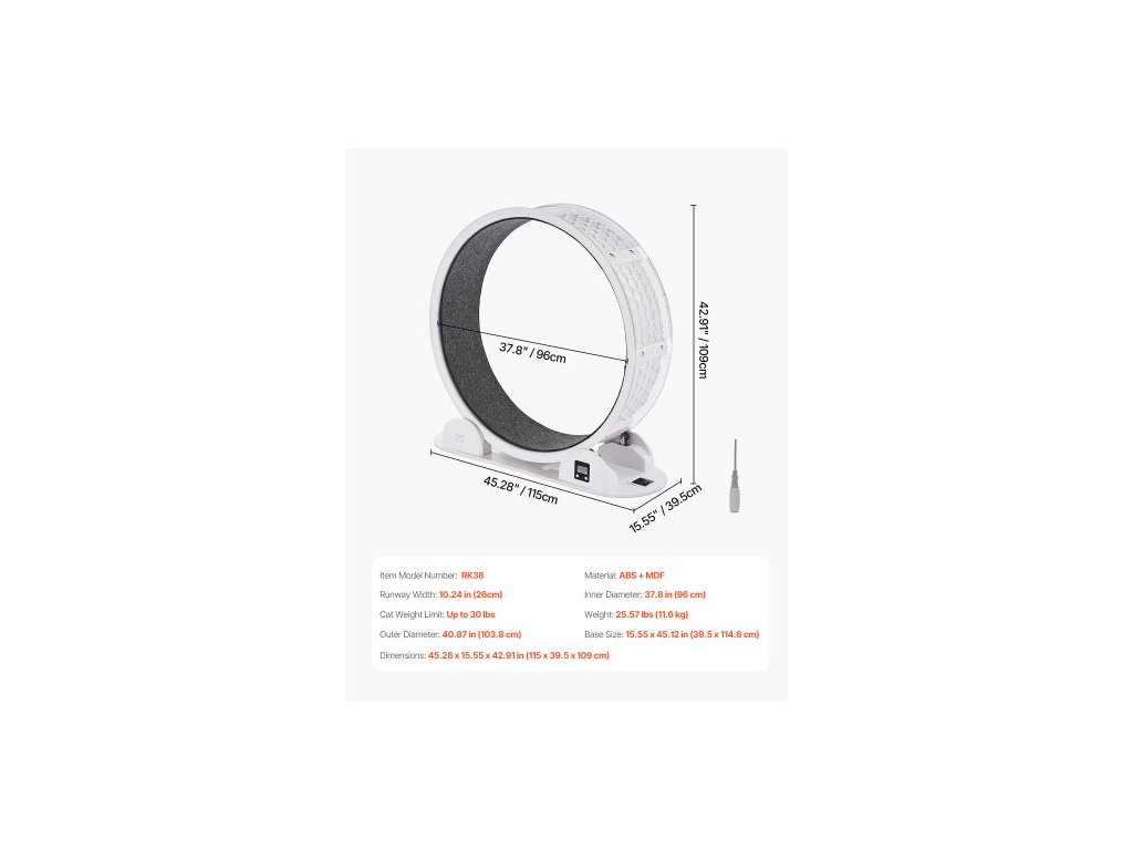 Vnější průměr: 40,87 palce (1038 mm), Velikost základny: 15,55 x 45,12 palce (395 x 1146 mm), Vnitřní průměr: 37,8 palce (960 mm), Hmotnostní limit pro kočky: Až 30 liber, Číslo modelu položky: RK38, Rozměry: 45,28 x 15,55 x 42,91 palce (1150 x 395 x 1090 mm) mm),Materiál: ABS + MDF,Hmotnost: 11,6 kg,Šířka dráhy: 260 mm
