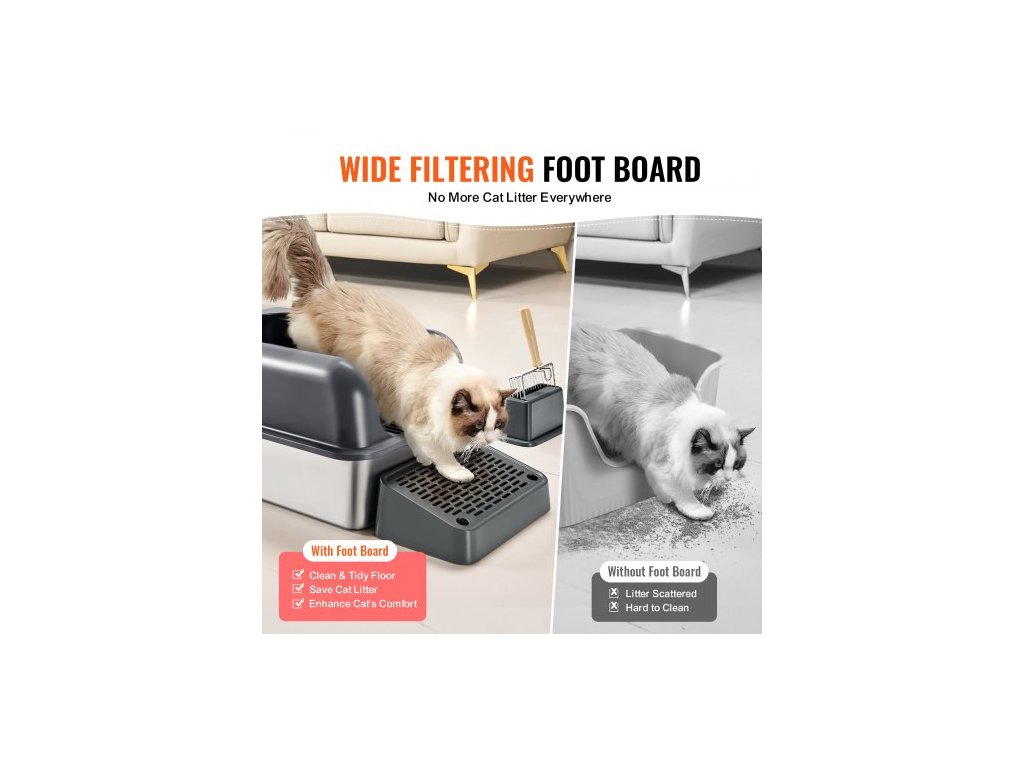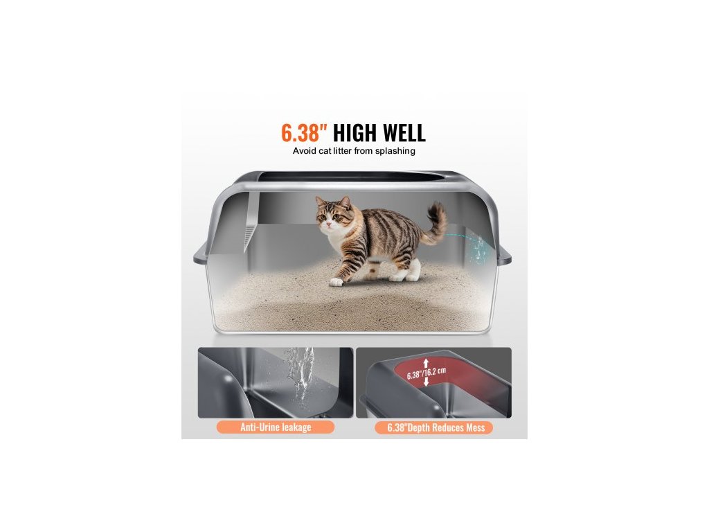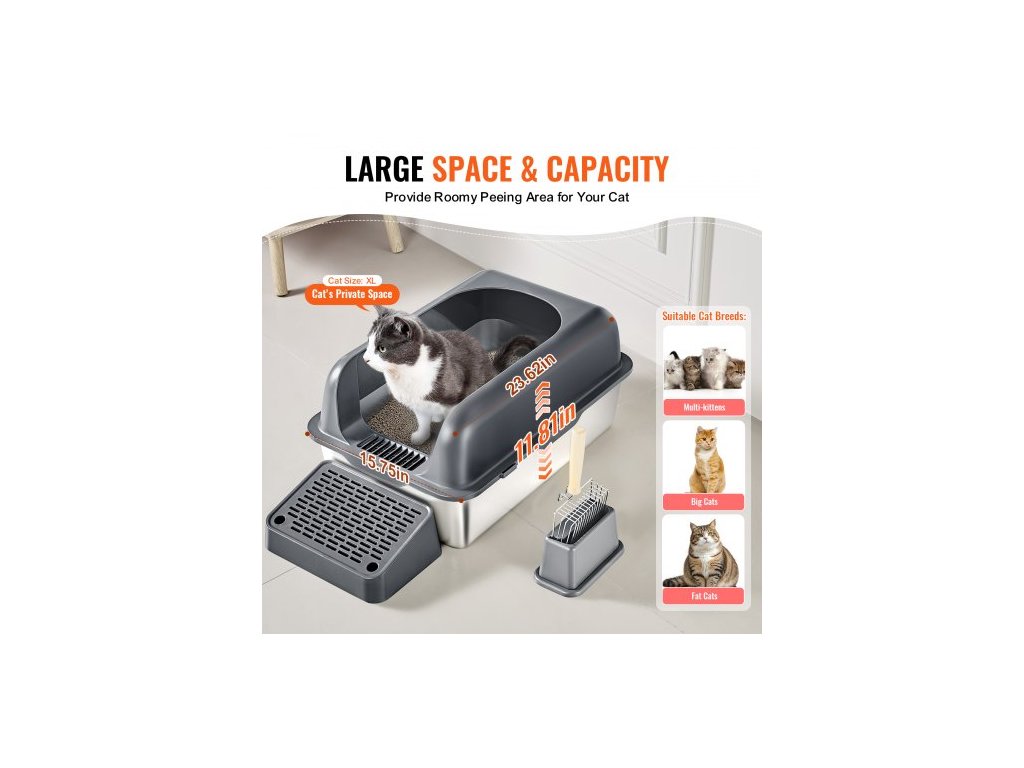 Kočičí toaleta , hloubka 6 palců, XL extra velká nerezová kočičí toaleta s naběračkou, široká filtrační nožní deska a vysoké bočnice, uzavřená, bez zápachu, snadno čistitelná, vhodná pro velké kočkyČistý prostor