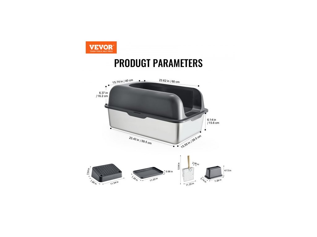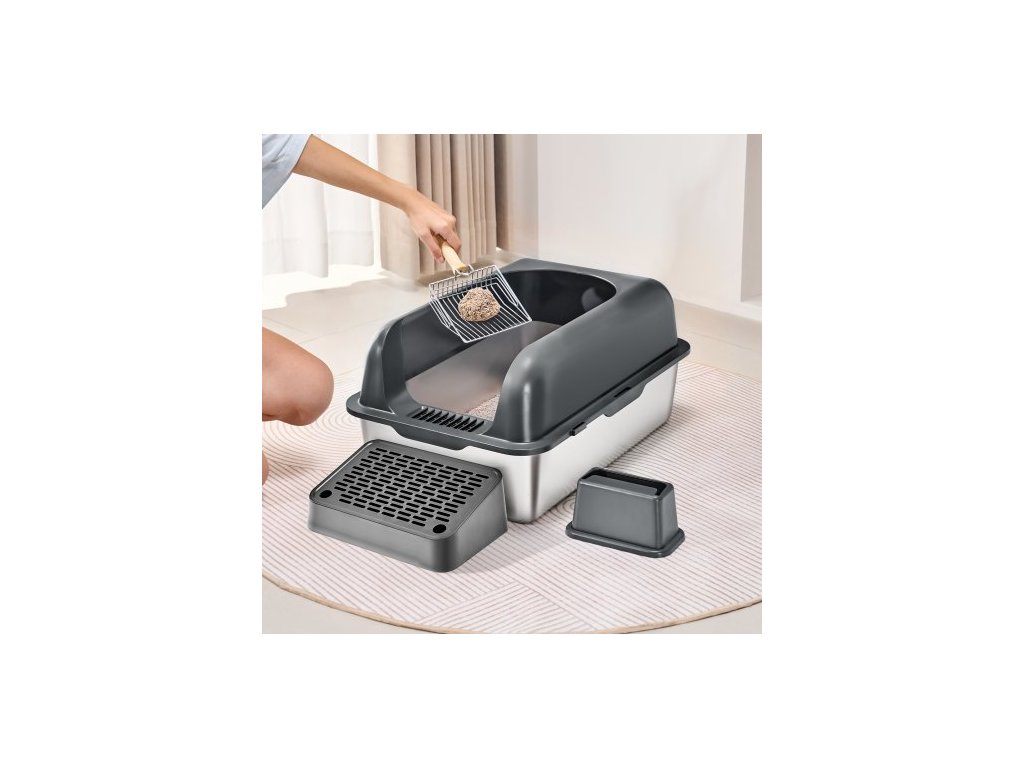 Kočičí toesta , hloubka 15 cm, XL extra velká nerezová kočičí toesta s naběračkou, širokou filtrační deskou a vysokými bočnicemi, uzavřená, bez zápachu, snadno čistitelná, vhodná pro velké kočky
