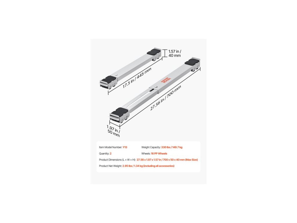 rozšířená velikost: 21,5 x 1,5 palce/546,1 x 38,1 mm, velikost koleček: 1,1 x 0,827 palce/28 x 21 mm, materiál těla: uhlíková ocel, číslo modelu: Y13, hmotnost výrobku: 3 lbs/1,34 kg, nosnost jednoho závaží: 330 lbs/150 kg, celková nosnost 2 vozíků: 660 lbs/300 kg, materiál koleček: ABS + Polyuretan + PP, neroztažený, rozměry: 13,35 x 1,5 palce / 339,1 x 38,1 mm