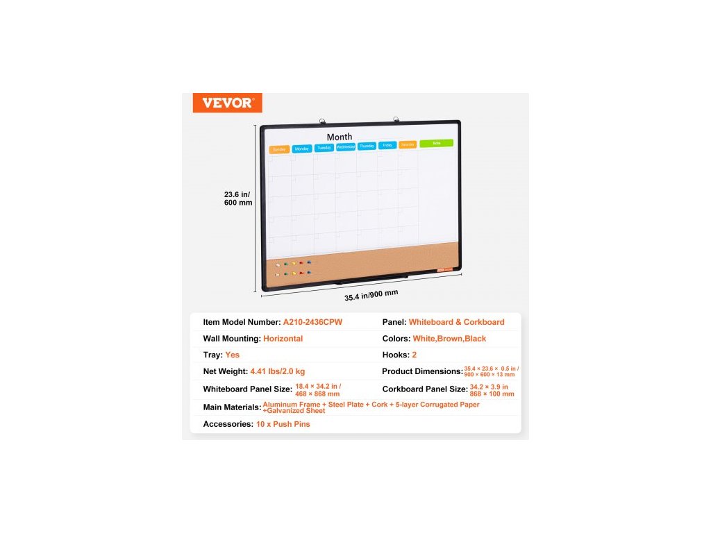 Rozměry panelu bílé tabule: 18,4 × 34,2 palce/468 × 868 mm,Panel: Bílá tabule a korková tabule,Tác: Ano,Barvy: Bílá, Hnědá, Černá,Hlavní materiály: Hliníkový rám + ocelový plech + korek + 5vrstvá vlnitá papírová deska + pozinkovaný plech,Číslo modelu položky: A210-2436CPW,Montáž na zeď: Horizontální,Háčky: 2,Rozměry panelu korkové tabule: 34,2 × 3,9 palce/868 × 100 mm,Rozměry produktu: 23,6 × 35,4 × 0,5 palce/600 × 900 × 13 mm, Čistá hmotnost: 4,41 lbs/2,0 kg