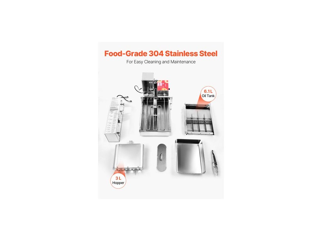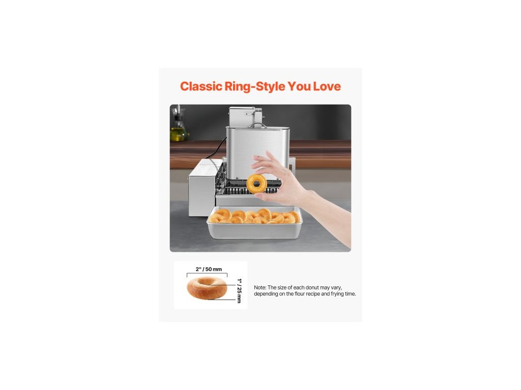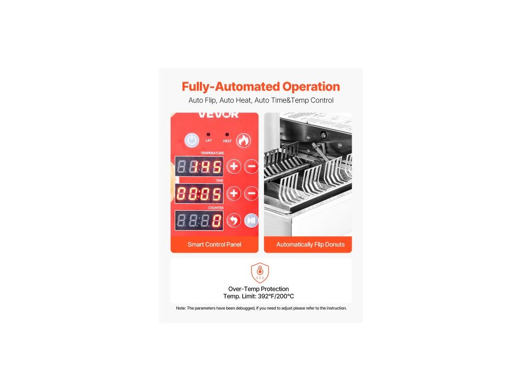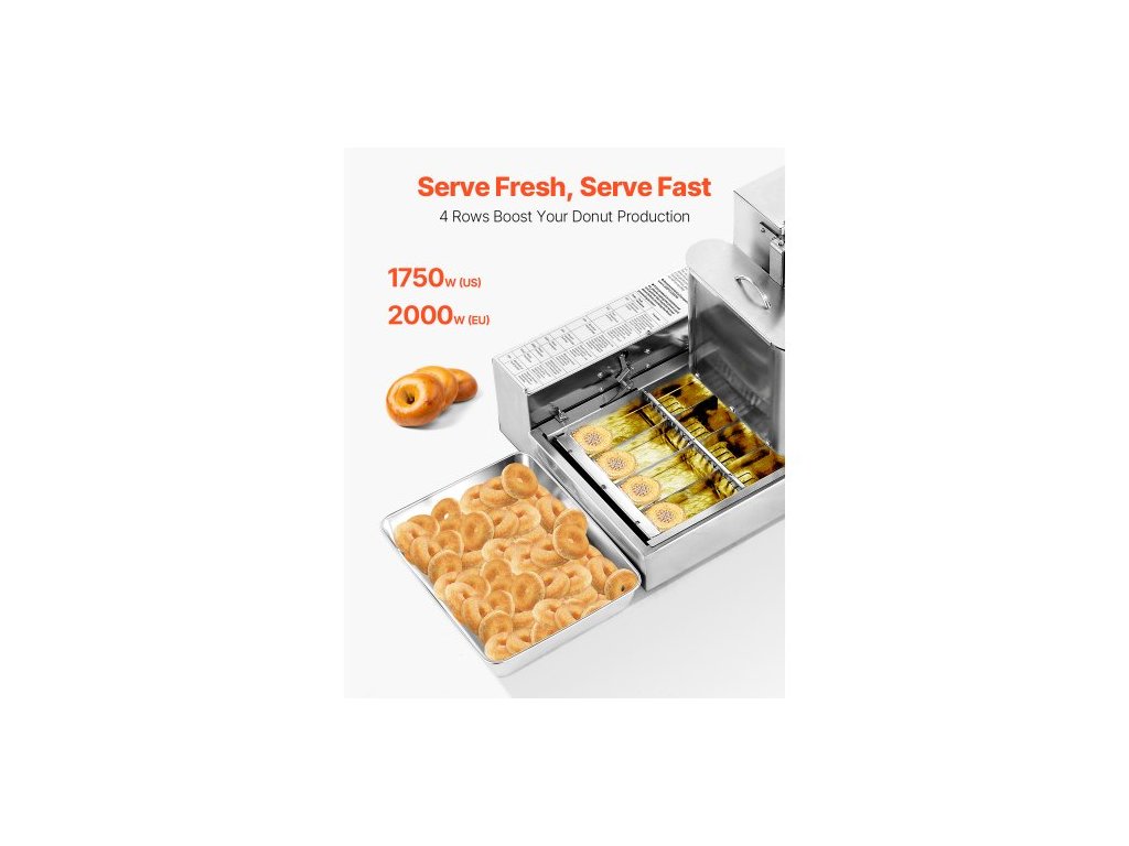 Objem násypky: 3 l, Vnější průměr koblihy: 1,2"-2,4" / 30-60 mm, Počet řad koblih: 4, Tloušťka koblihy: 0,6"-1,2" / 15-30 mm, Napětí: US: AC120V 60Hz, EU: AC220-240V 50Hz, Číslo modelu položky: US: ZDT-4, EU: ZDT-4-EU, Hmotnost výrobku: 33 lbs / 15 kg ± 3 %,Objem olejové nádrže: 6,1 l,Materiál: nerezová ocel 304,Výkon: US: 1750 W, EU: 2000 W
