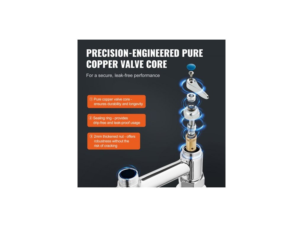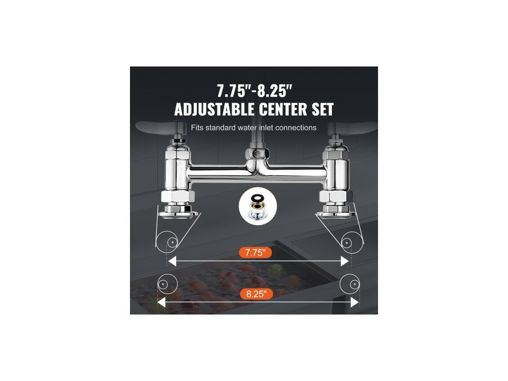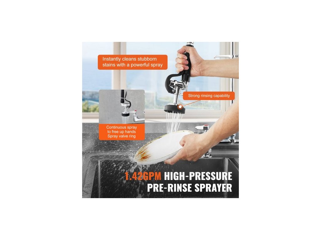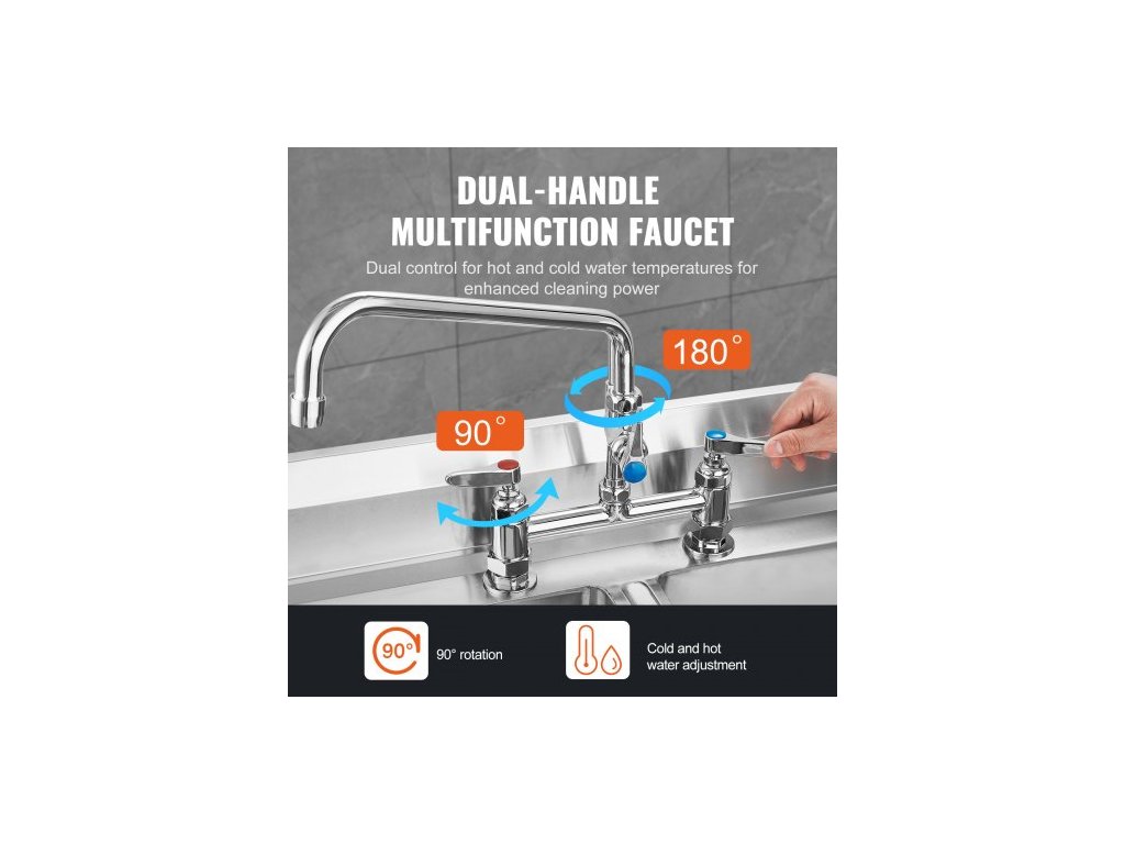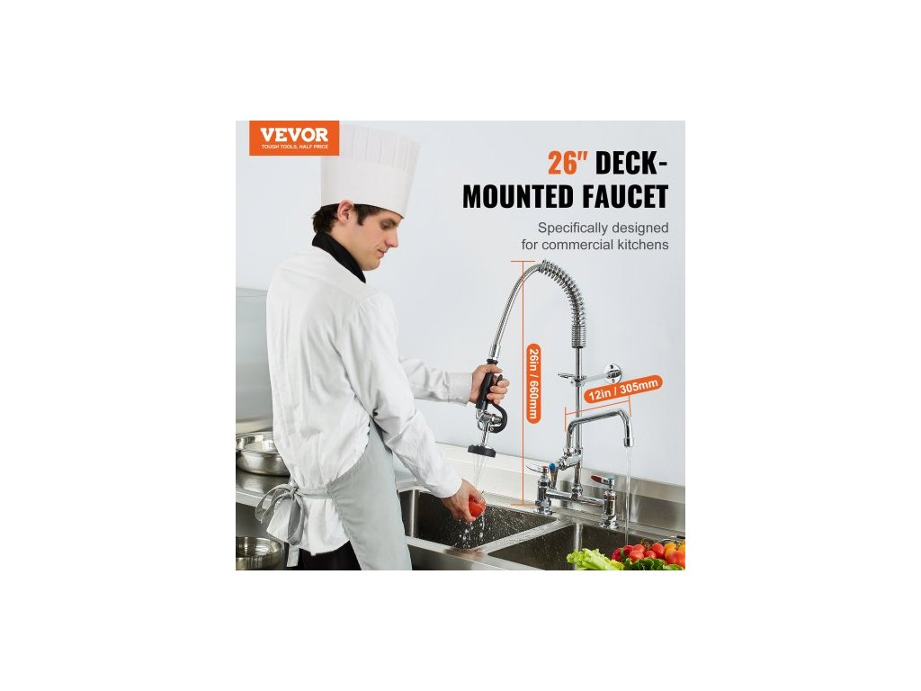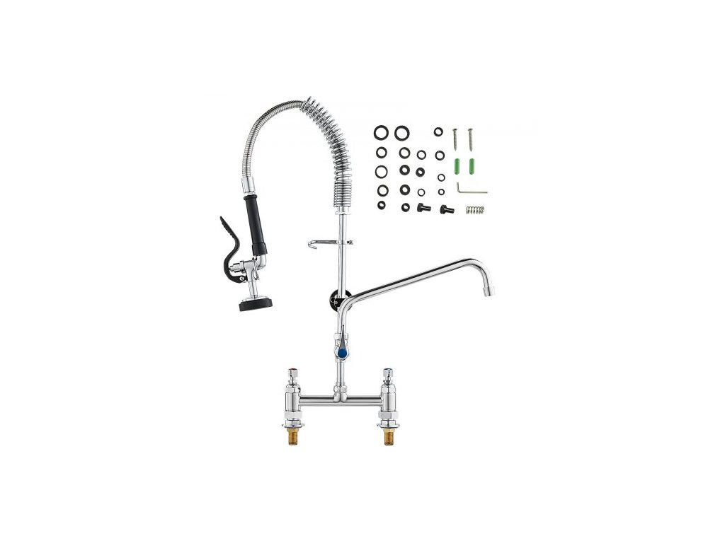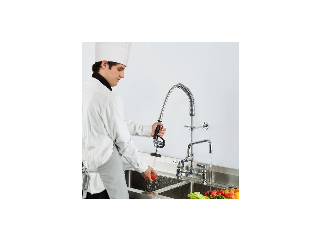 Komerční baterie s předoplachovým rozprašovačem, výška 66 cm, středový otvor 20,3 cm, otočný výtok 30,5 cm, stojanová baterie k uchycení na kuchyňský dřez, mosazná konstrukce s tažnou sprchou, pro dřez s 1/2/3 přihrádkamiDvojitý výtok