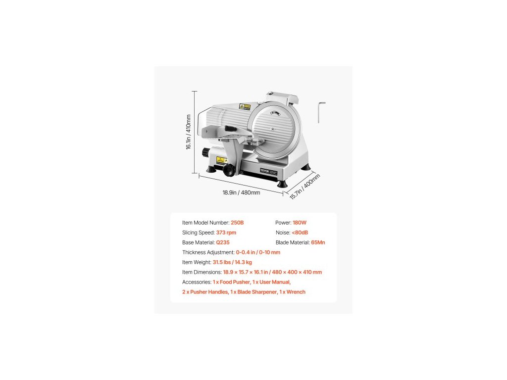Rychlost krájení: 373 ot./min, Materiál čepele: 65Mn, Hlučnost: <80dB, Číslo modelu položky: 250B, Nastavení tloušťky: 0-0,4 palce / 0-10 mm, Rozměry položky: 18,9 x 15,7 x 16,1 palce / 480 x 400 x 410 mm, Příkon: 180W, Základní materiál: Q235, Hmotnost položky: 31,5 14,3 kg