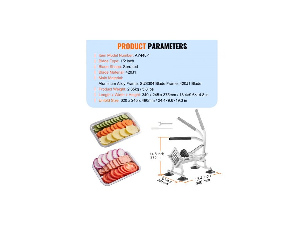 Komerční kráječ zeleniny, 1/2 palcový kráječ ovoce, kráječ zeleniny z nerezové oceli a hliníkové slitiny, ruční kráječ s protiskluzovými nožičkami, na ředkvičky, cibuli, brambory, citrony