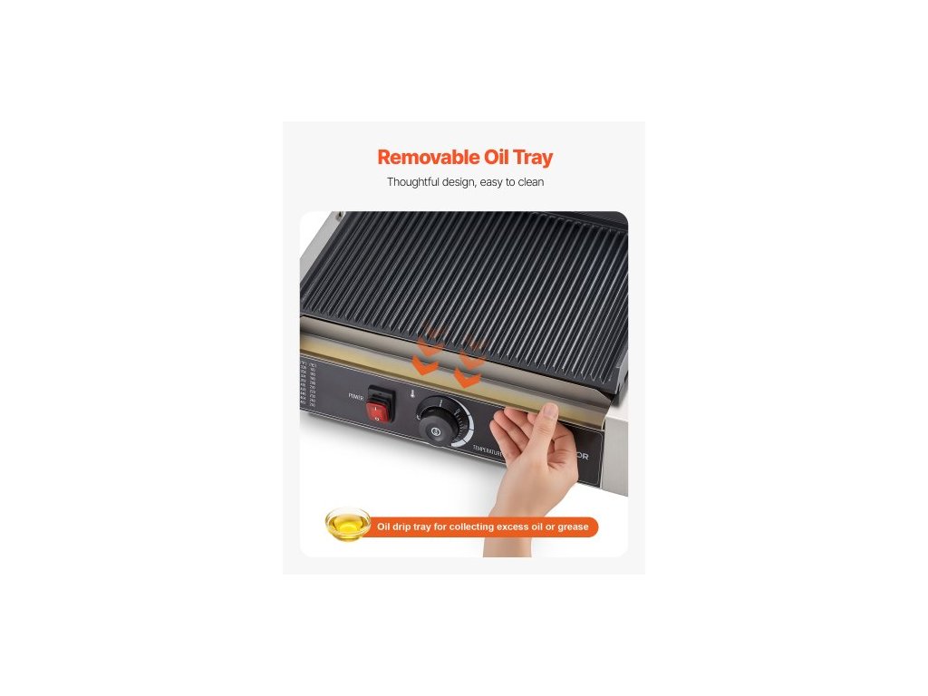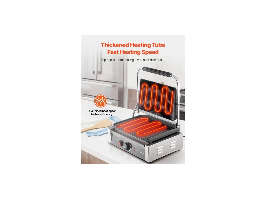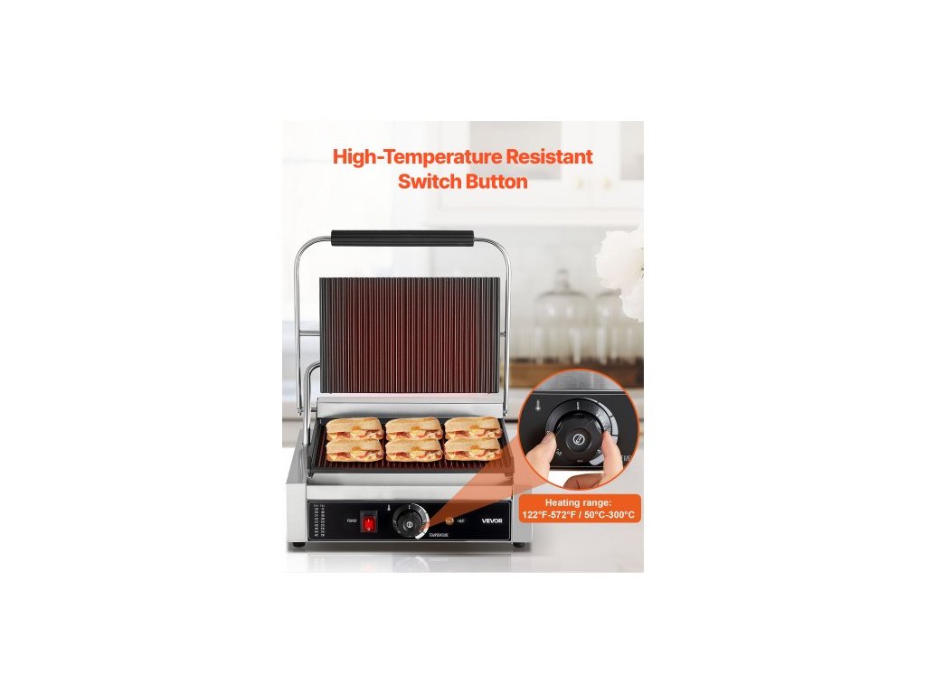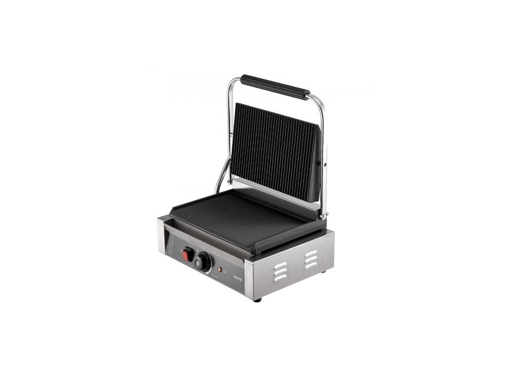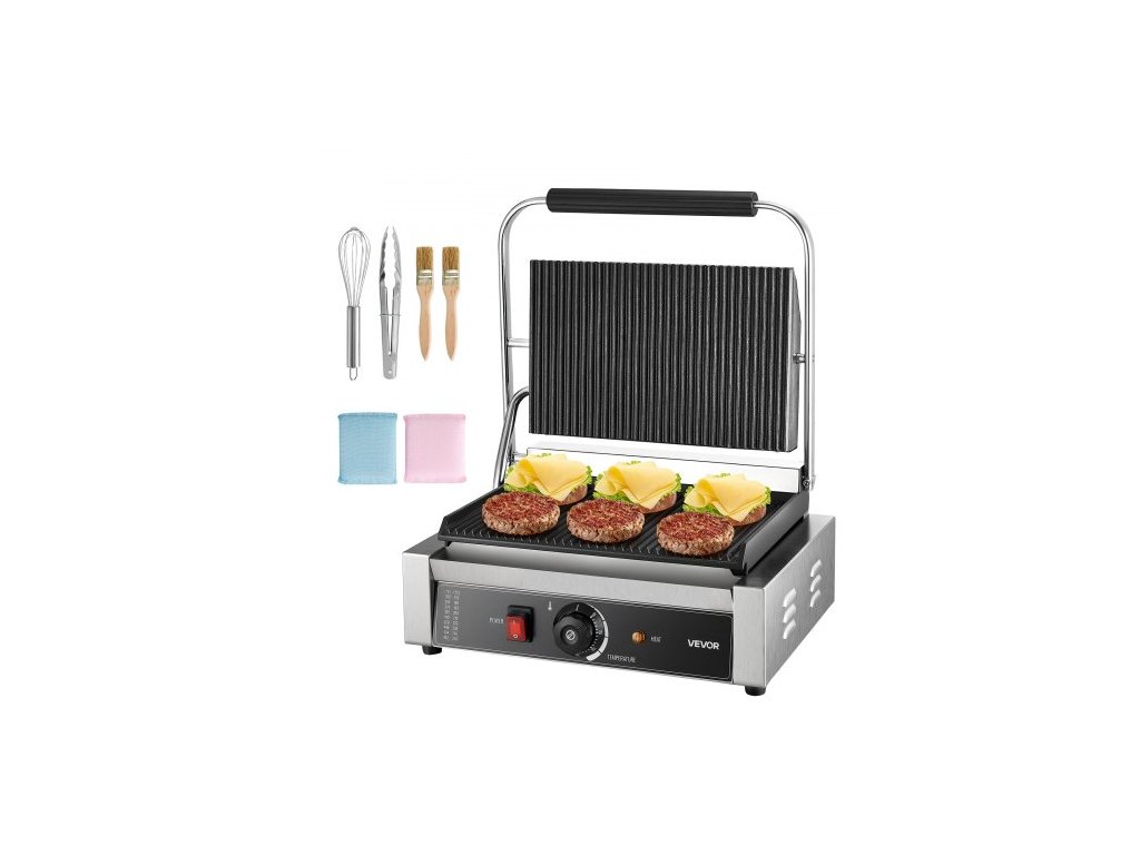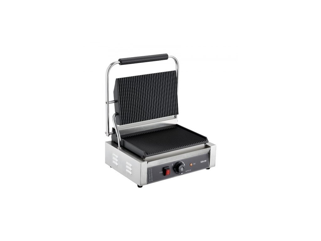 Komerční panini gril, elektrický sendvičovač panini 2200 W, nerezový sendvičový lis s rukojetí a regulací teploty, 34x23 cm drážkovaný smaltovaný plech, na hamburger, steak, slaninuMultifunkční