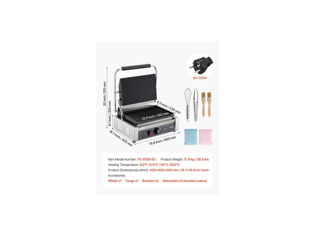 Číslo modelu: YS-812B-EU,Hmotnost výrobku: 17,9 kg / 39,5 lbs,Teplota ohřevu: 50°C-300°C ±15°,Rozměry výrobku: 425x400x205 mm / 16,7x15,8x8,1 palce