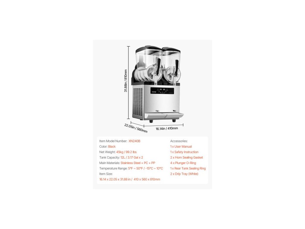 Objem nádrže: 3,17 gal x 2 / 12 l x 2,Hlavní materiály: nerezová ocel + PC + PP,Číslo modelu položky: XN240B,Teplotní rozsah: 5℉ ~ 50℉ / -15℃ ~ 10℃,Čistá hmotnost: 99,2 lbs / 45 kg,Rozměry výrobku: 16,14 x 22,05 x 31,88 palců / 410 x 560 x 810 mm