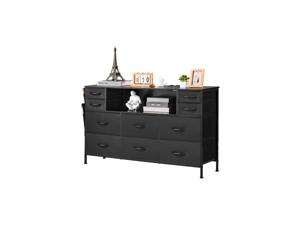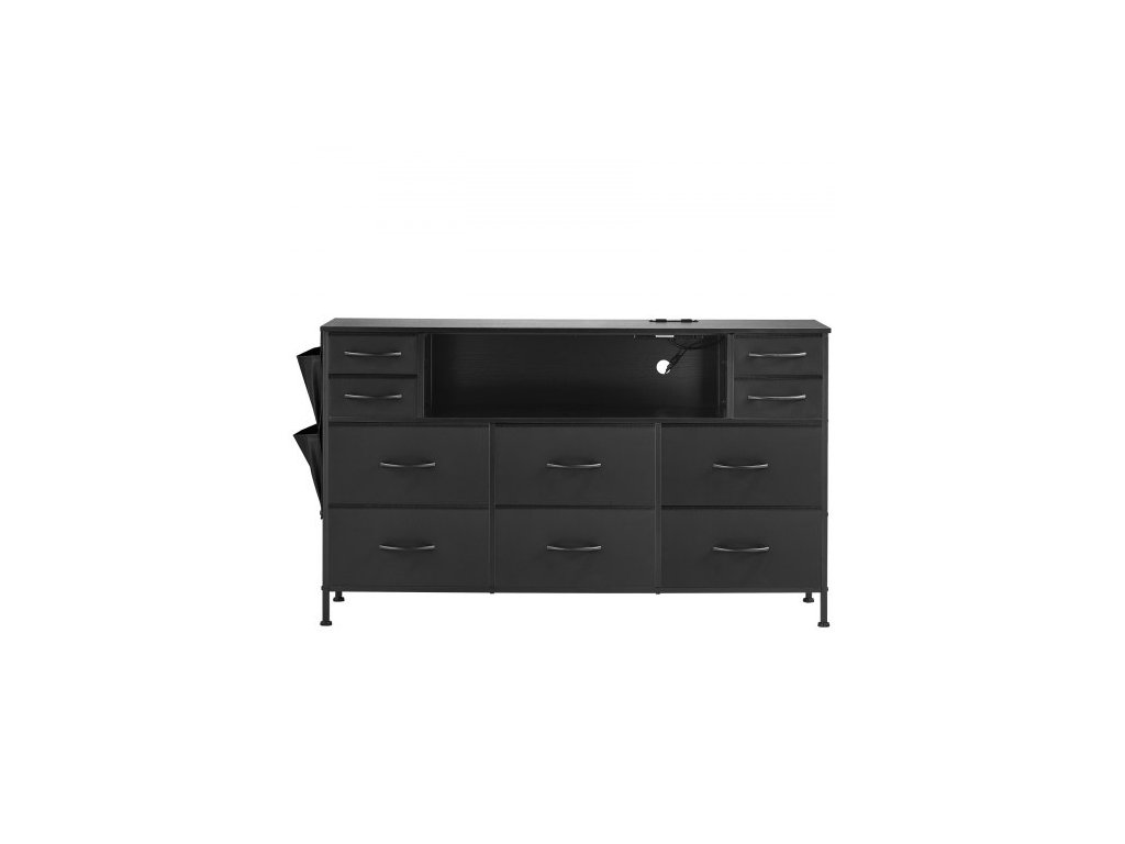 Komoda s 10 zásuvkami, látková komoda s přihrádkami na látky, úložné zásuvky do skříně s otevřenou policí, LED osvětlením a vestavěnou zásuvkou, věž na úložné prostory do ložnice, chodby, skříně, černá
