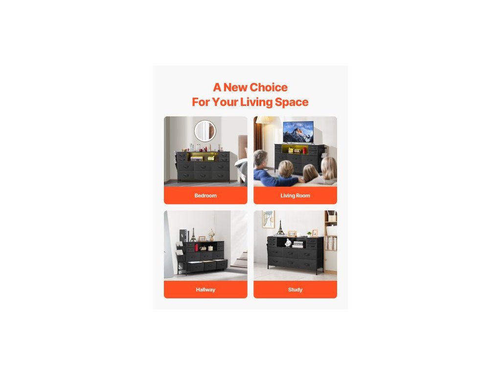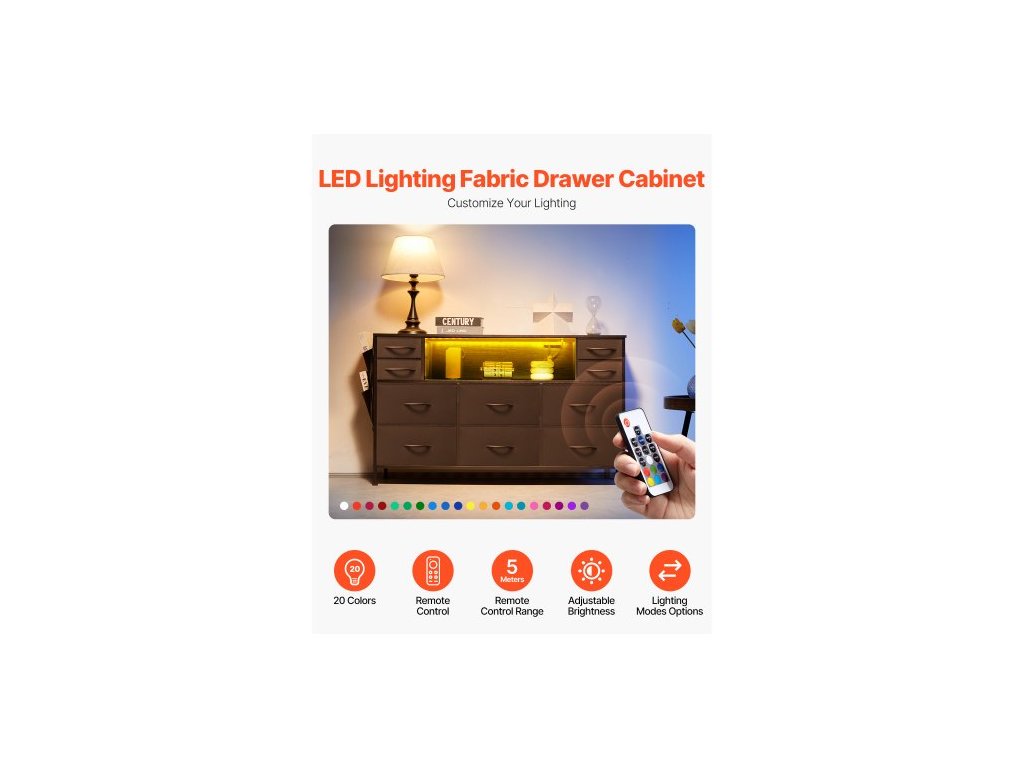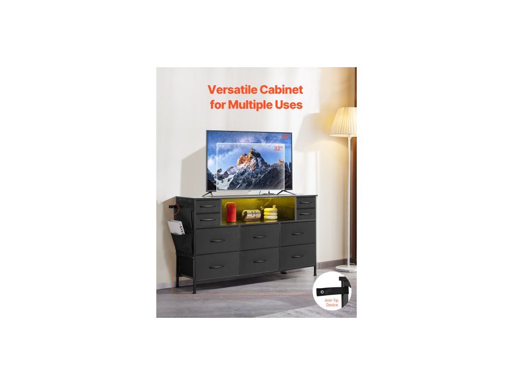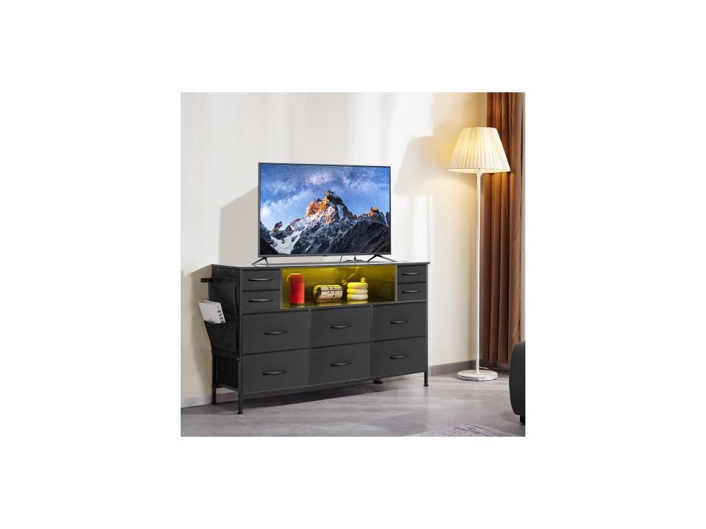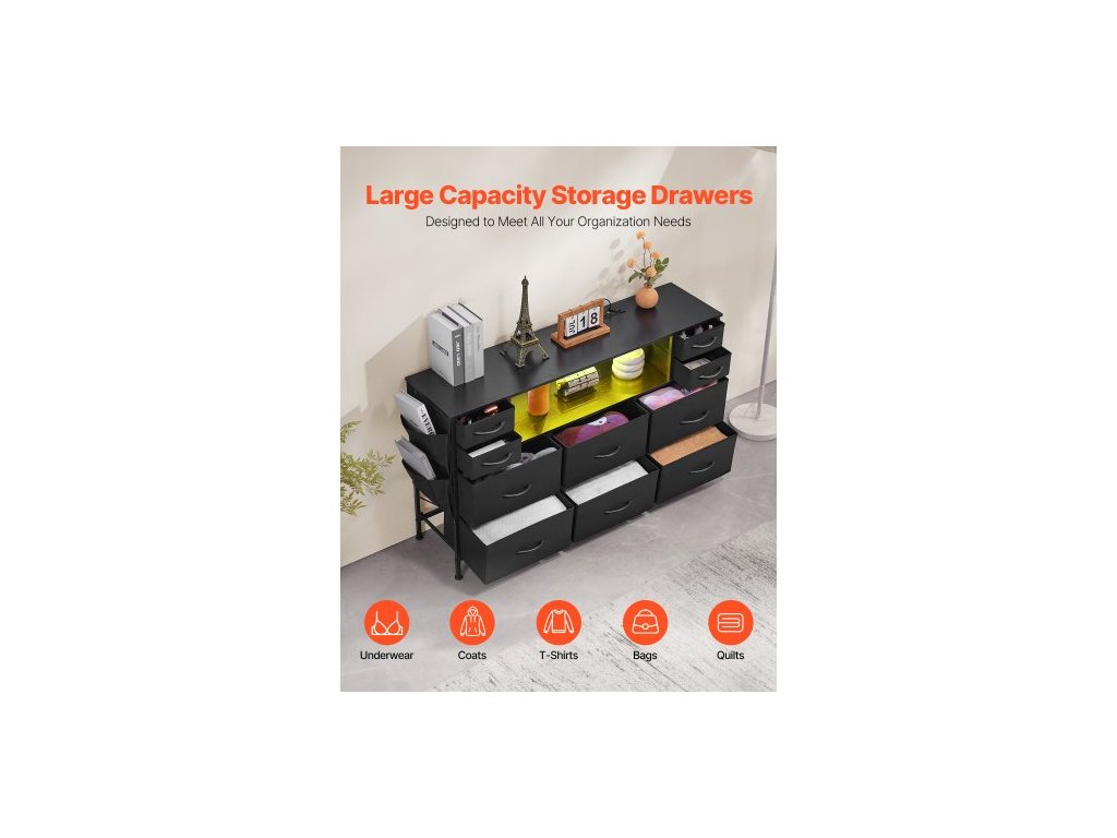 Komoda s 10 zásuvkami, látková komoda s přihrádkami na látky, úložné zásuvky do skříně s otevřenou policí, LED osvětlení a vestavěná zásuvka, věž na látky do ložnice, chodby, do skříně, černáNavodí náladu