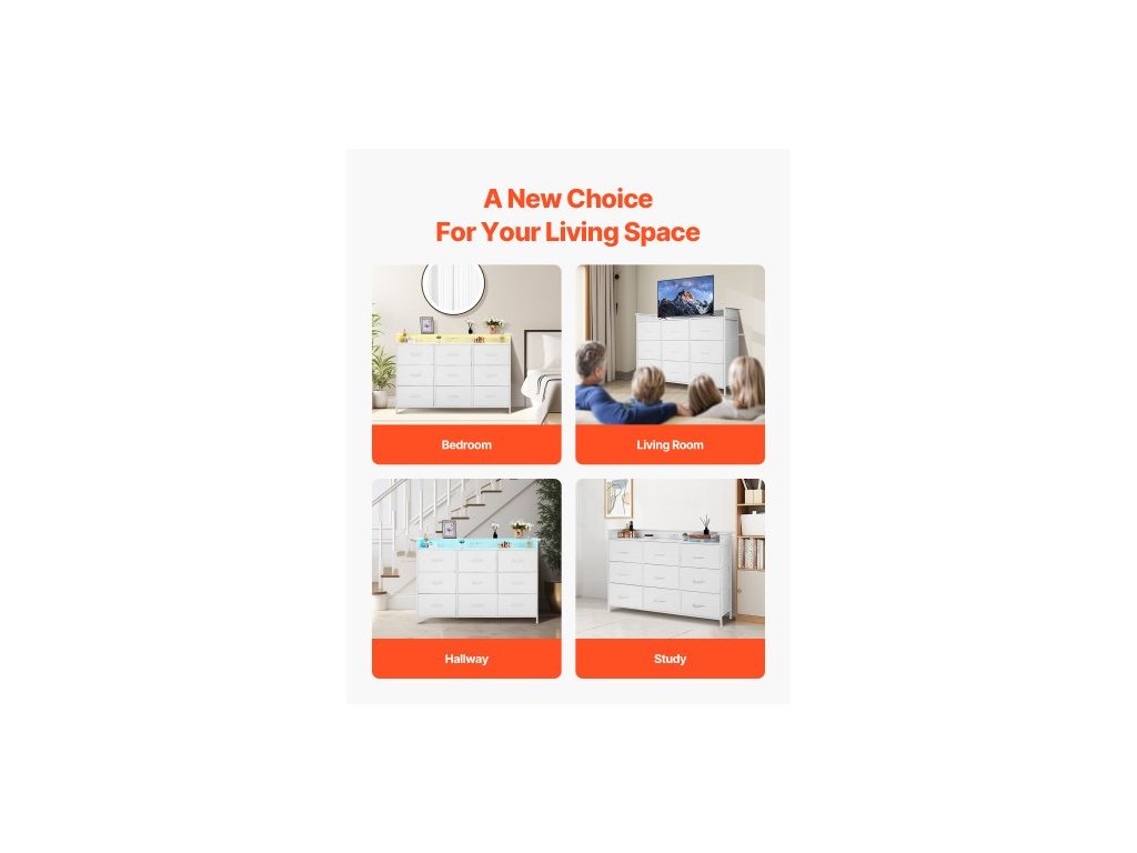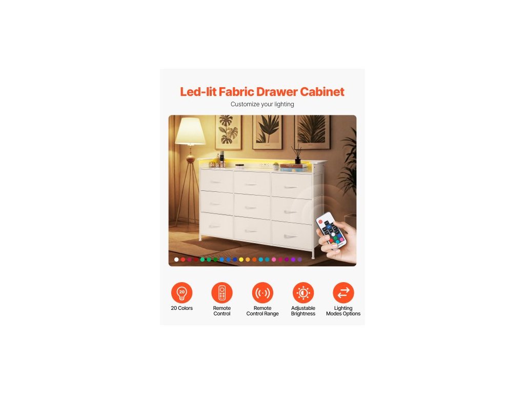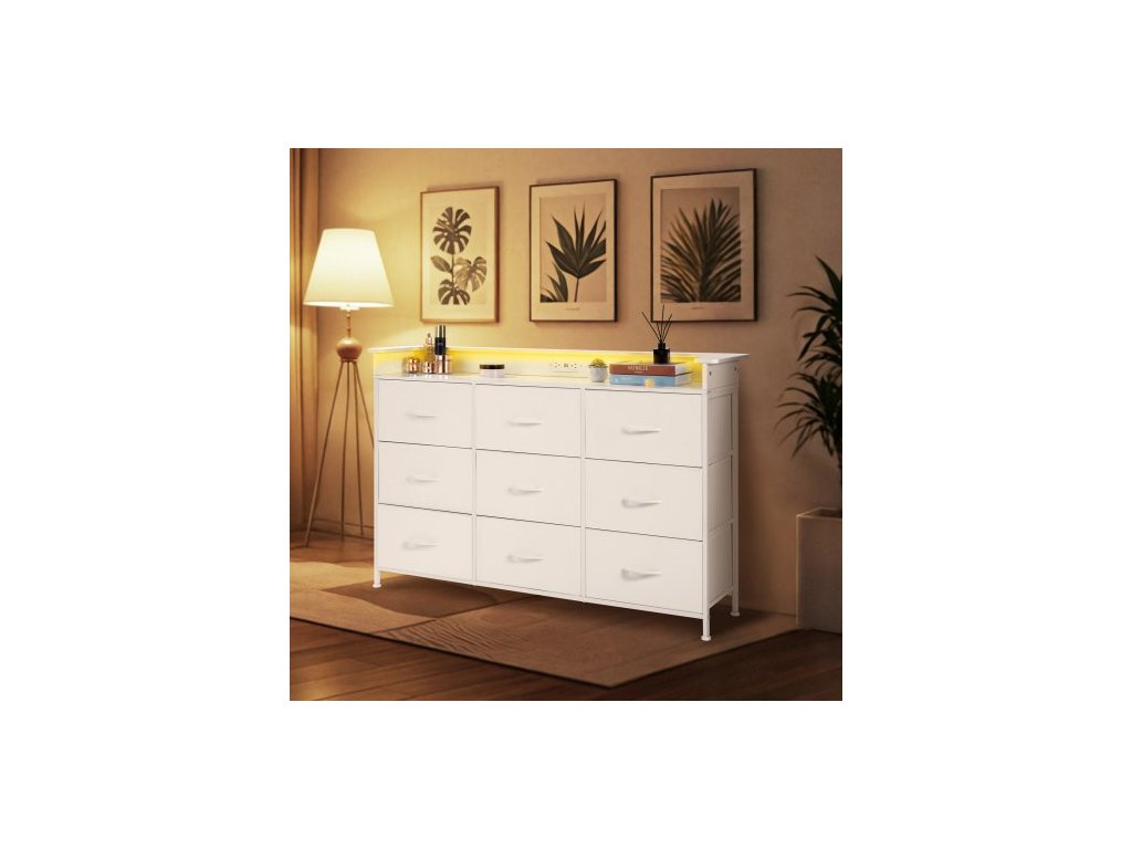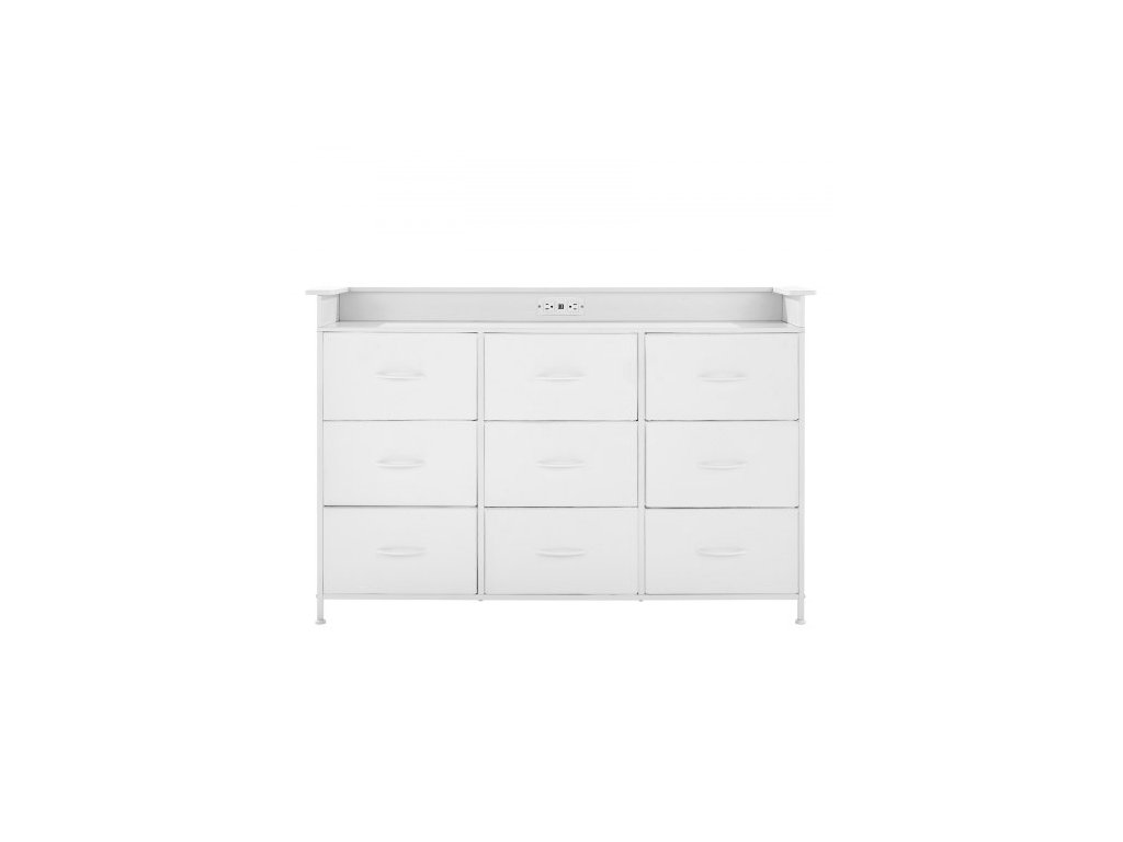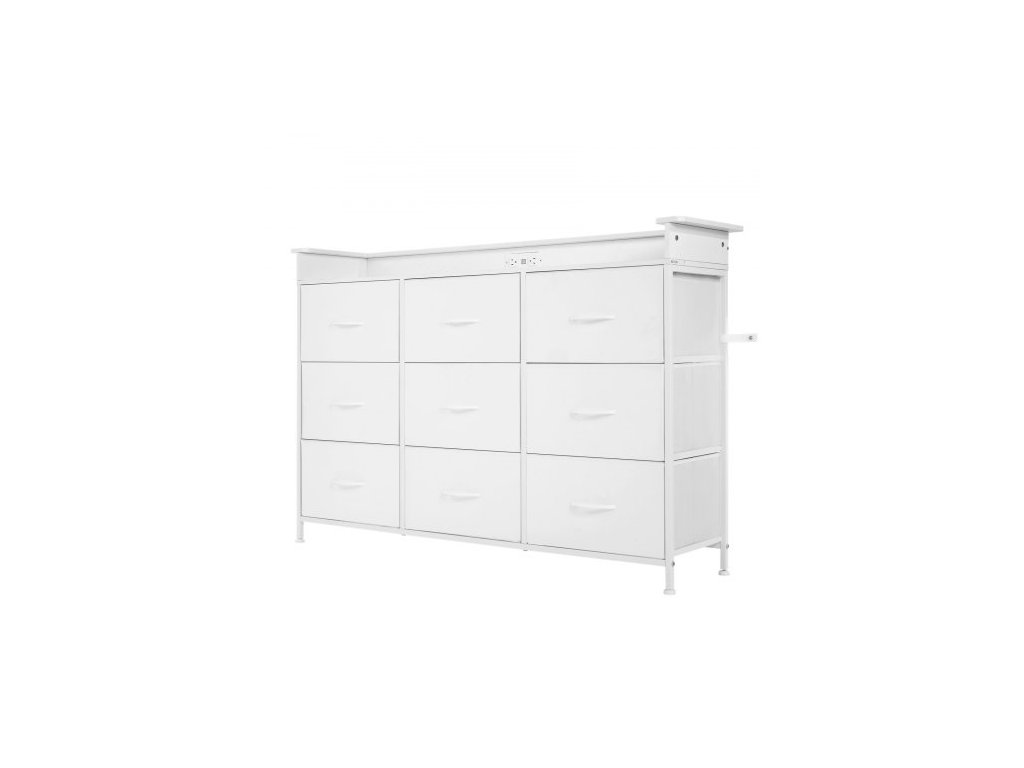 Komoda s 9 zásuvkami, vysoká komoda se zásuvkami a košem na látky, úložné zásuvky ve skříni s robustním kovovým rámem, LED osvětlení a vestavěná zásuvka, věž na látky do ložnice, chodby, skříně, bíláNavodí náladu