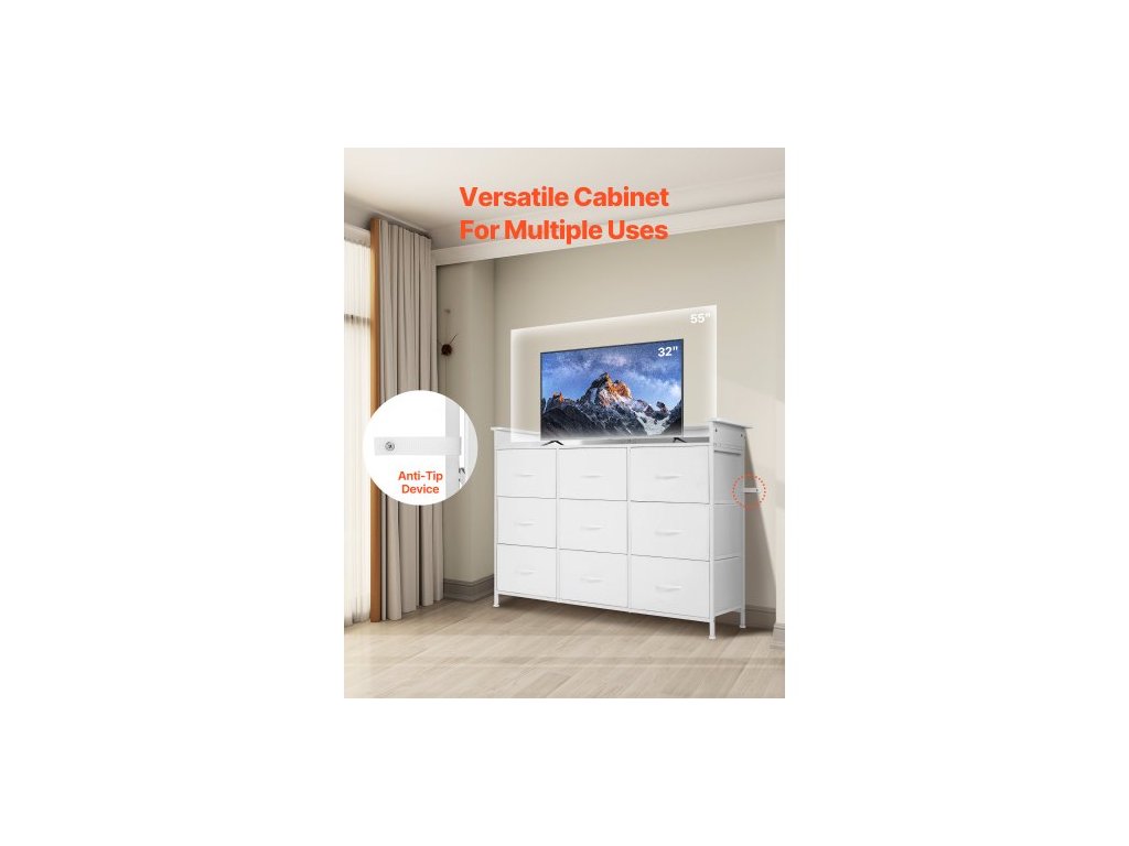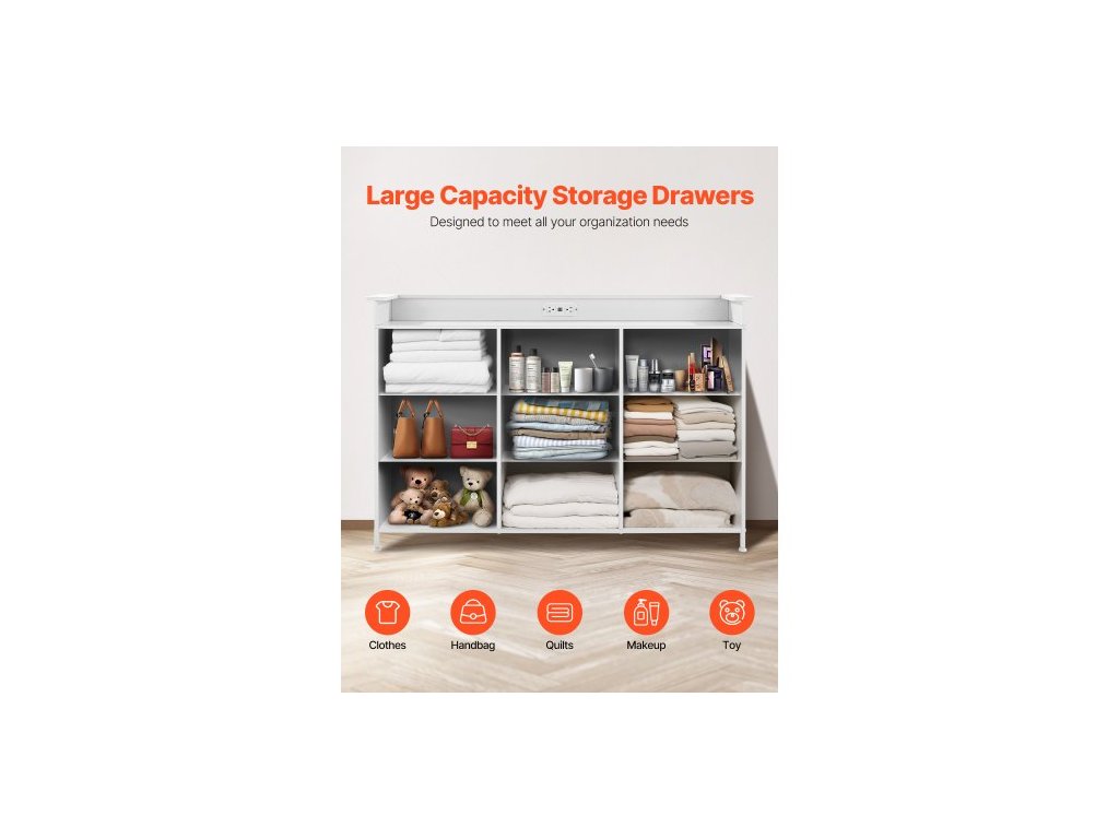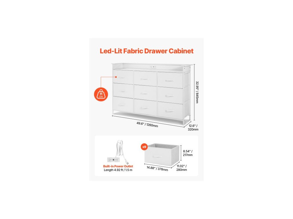 Komoda s 9 zásuvkami, vysoká zásuvková komoda s košem na látky, úložné zásuvky do skříně s pevným kovovým rámem, LED osvětlení a vestavěná zásuvka, věž na úložné látky do ložnice, chodby, skříně, bílá