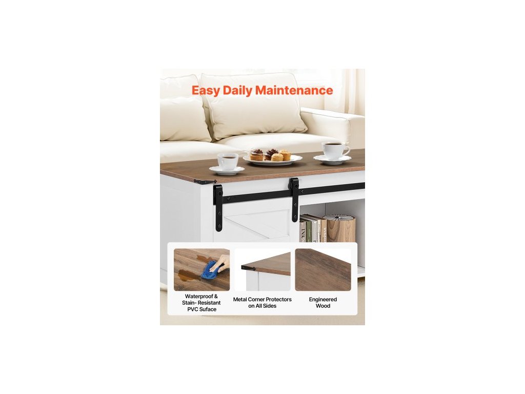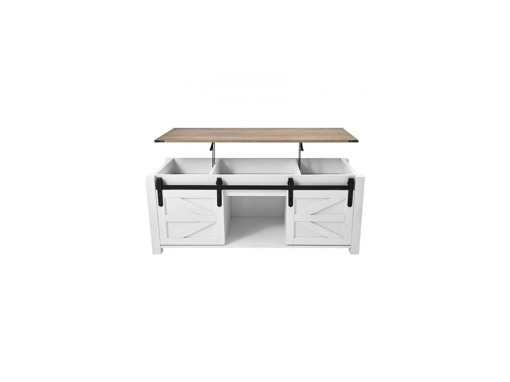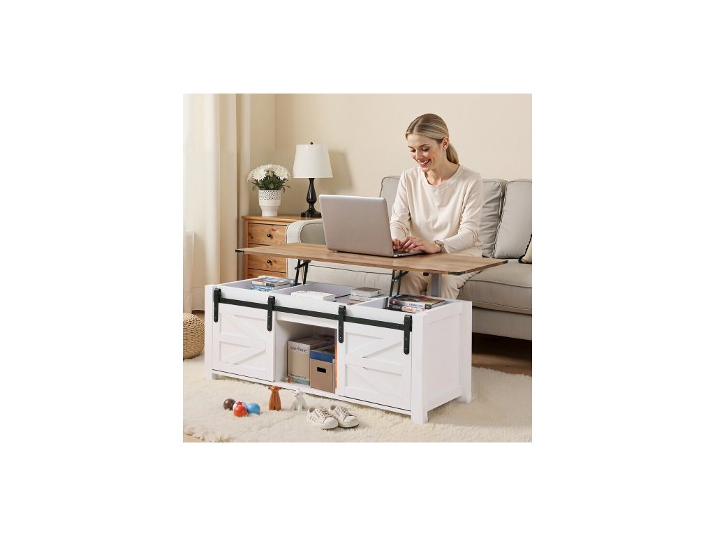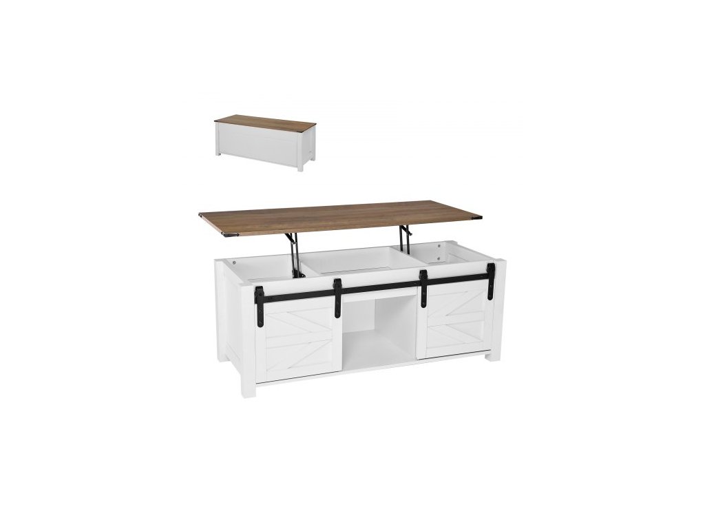Konferenční stolek 1200 mm s výsuvnou deskou ve stylu farmářského domu, rustikální středový stůl s dvířky do stodoly a skrytým úložným prostorem, moderní obdélníková zvedací deska stolu do obývacího pokoje, kanceláře, domácnosti, snadná montáž, bílýRustikální farmářský styl