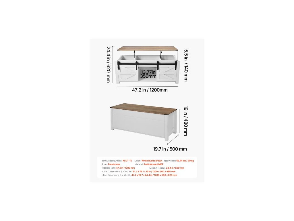 Velikost desky stolu: 47,2 palce / 1200 mm, Rozměry ve zvednutém stavu (D x Š x V): 47,2 x 19,7 x 24,4 palce / 1200 x 500 x 620 mm, Barva: Bílá rustikálně hnědá, Číslo modelu položky: KLCT-15, Rozměry ve skladovacím stavu (D x Š x V): 47,2 x 19,7 x 19 palců / 1200 x 500 x 480 mm, Styl: Farmářský Materiál: Dřevotříska MDF, Čistá hmotnost: 30 kg, Maximální výška zdvihu: 620 mm