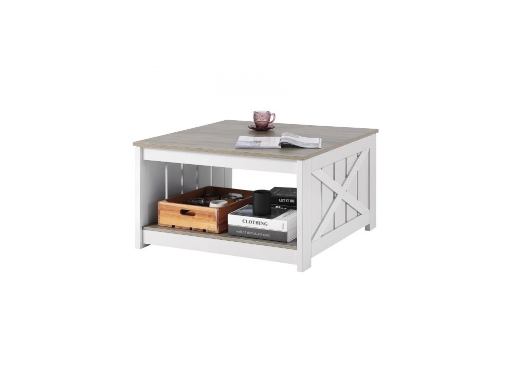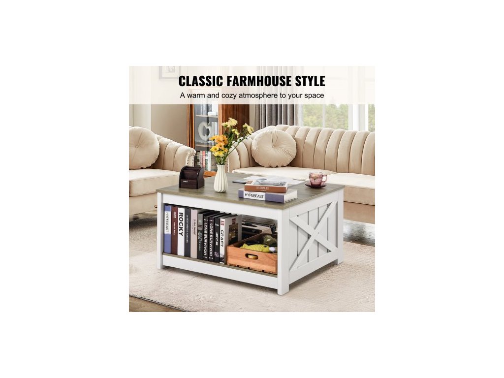 Konferenční stolek 31,5" ve farmářském stylu, čtvercový konferenční stolek s otevřeným úložným prostorem, dřevěný rustikální koktejlový stolek do obývacího pokoje, ložnice, bytu, studia, šedobílýNový trend v bydlení