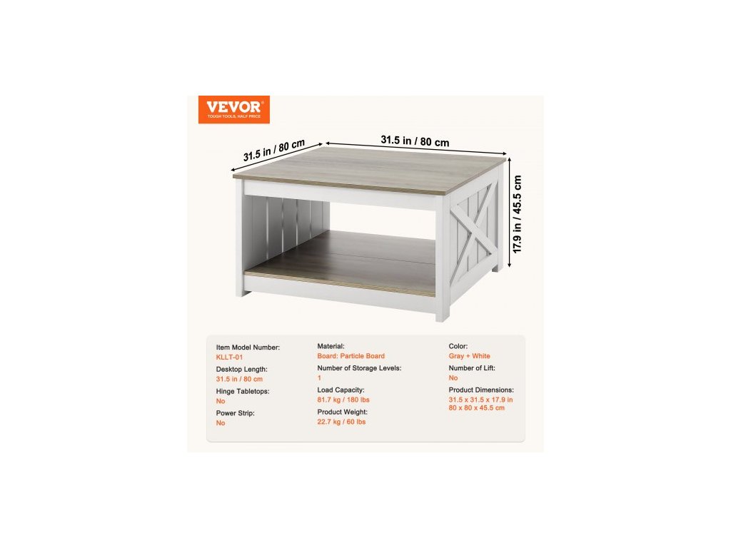 Prodlužovací kabel: Ne,Počet zvedacích/pantových desek stolu: Ne,Počet úložných úrovní: 1,Nosnost: 81,7 kg / 180 lbs,Maximální výška stolu se zvedací deskou: Ne,Barva: Šedá + bílá,Číslo modelu položky: KLLT-01,Hmotnost výrobku: 22,7 kg / 60 lbs,Délka pracovní desky: 800 mm / 31,5 palců,Materiál: Dřevotříska,Rozměry výrobku: 800 x 800 x 455 mm / 31,5 x 31,5 x 17,9 palce