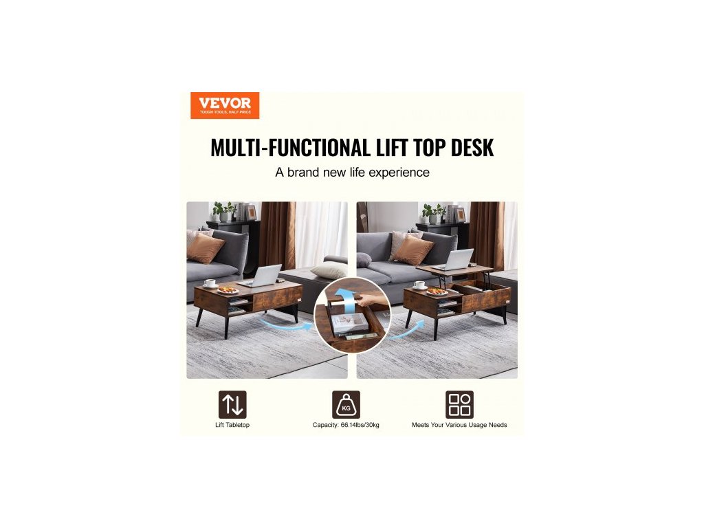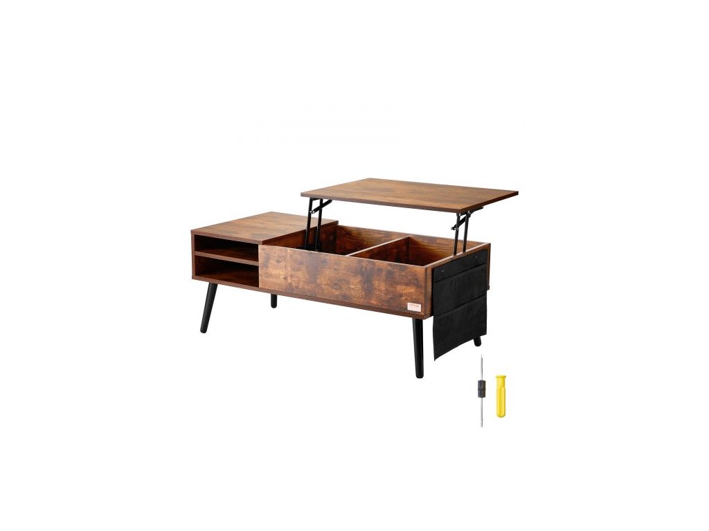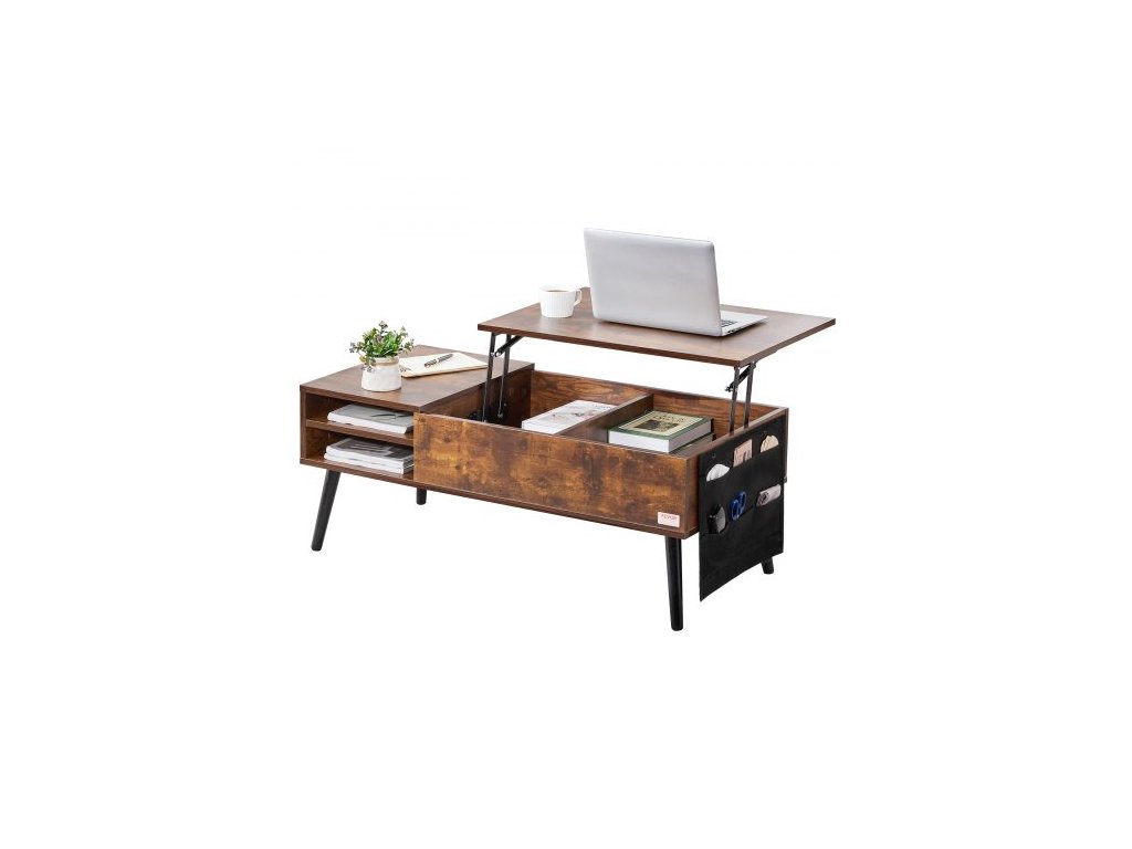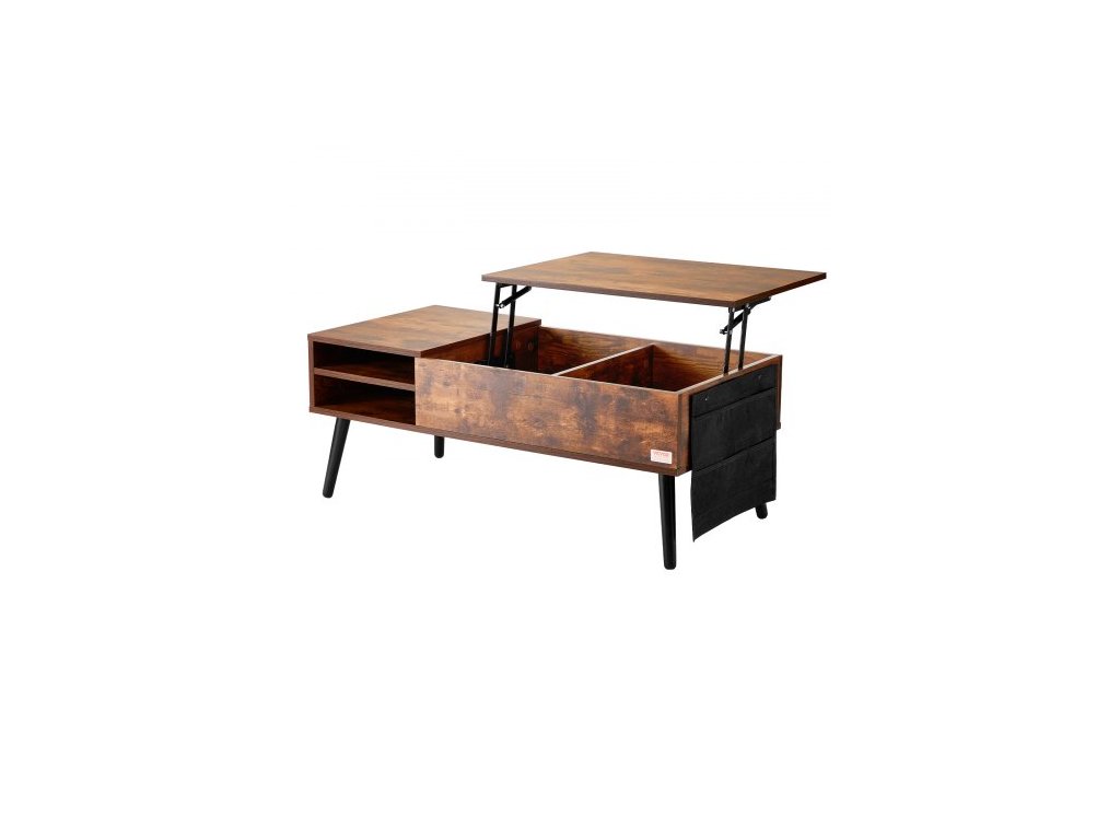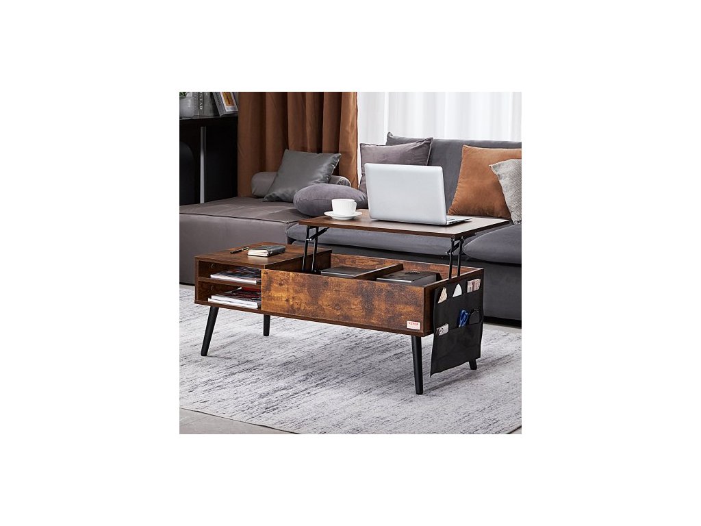 Konferenční stolek s výsuvnou deskou, obdélníkový konferenční stolek o šířce 99 cm s extra úložnými kapsami, výsuvný konferenční stolek do obývacího pokoje, hnědýMultifunkční nastavitelný konferenční stolek