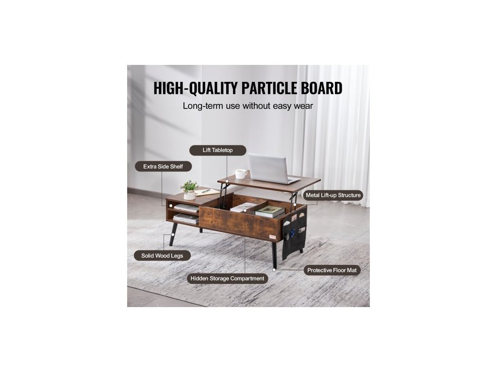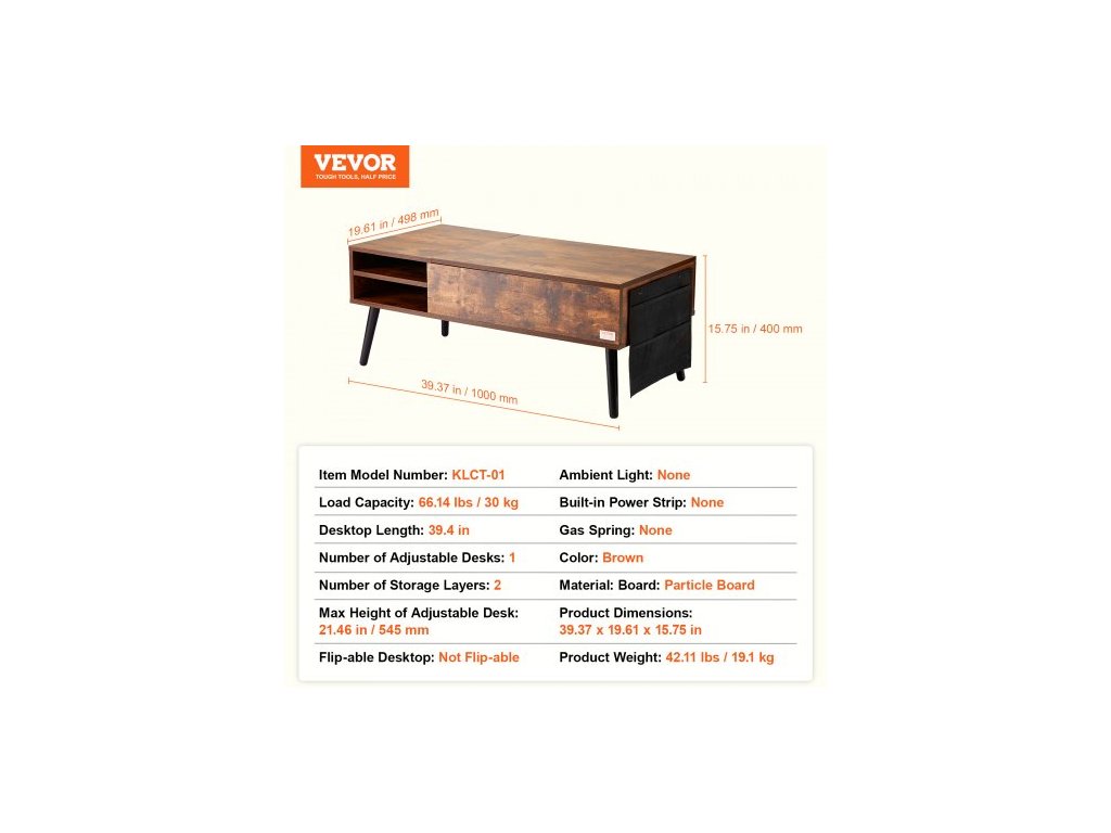 Počet nastavitelných desek: 1,Otočná deska: Neotočitelná,Barva: Hnědá,Plynová pružina: Žádná,Materiál: Dřevotříska,Vestavěný prodlužovací kabel: Žádný,Rozměry produktu: 1000 x 498 x 400 mm,Okolní osvětlení: Žádné,Počet úložných vrstev: 2,Nosnost: 30 kg,Číslo modelu položky: KLCT-01,Hmotnost produktu: 19,1 kg, délka stolu: 99,4 cm, maximální výška nastavitelného stolu: 545 mm