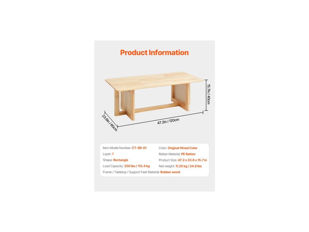Tvar: Obdélník,Materiál rámu / desky stolu / podpěrných nohou: kaučukovník,Nosnost: 250 lbs / 113,4 kg,Barva: Původní barva dřeva,Číslo modelu položky: CT-SR-01,Materiál ratanu: PE ratan,Čistá hmotnost: 11,25 kg / 24,8 lbs,Rozměry výrobku: 47,2 x 23,6 x 15,7 palce / 1200 x 600 x 400 mm