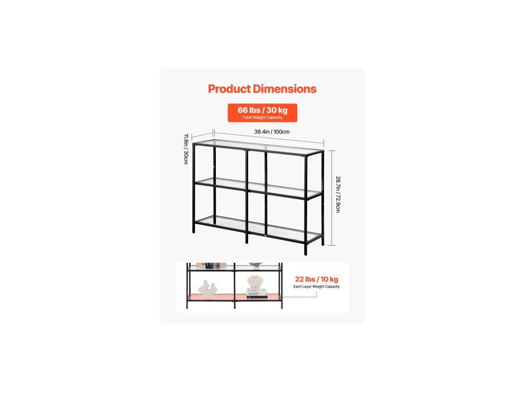 Počet úložných vrstev: 3 vrstvy, Nosnost jedné vrstvy: 10 kg, Celková nosnost: 30 kg, Číslo modelu položky: YJX-XGZ-003, Materiál: Železná trubka (Q195) + tvrzené sklo, Rozměry výrobku: 100 x 30 x 72,9 cm, Čistá hmotnost: 13 kg