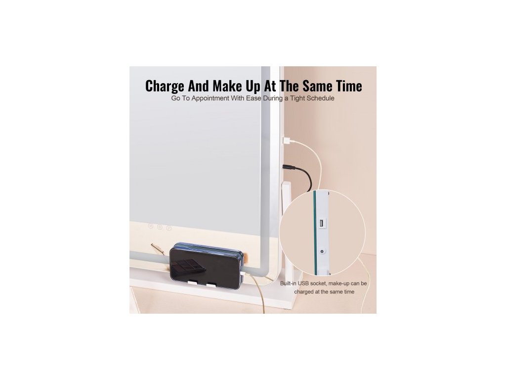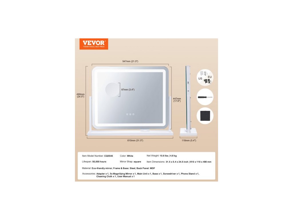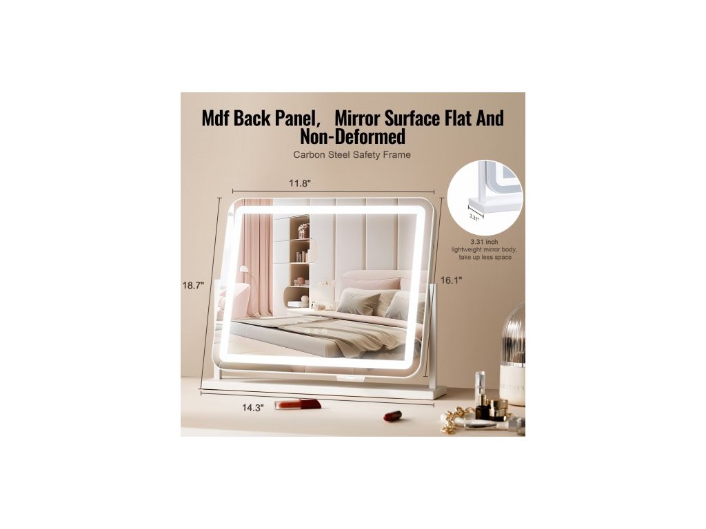 Tvar zrcadla: Čtvercový,Barva: Bílá,Číslo modelu položky: CQ5545,Rozměry položky: 31,5 x 5,4 x 24,5 palce / 610 x 118 x 490 mm,Materiál: Ekologické zrcadlo; Rám a podstavec: Ocel; Zadní panel: MDF,Čistá hmotnost: 10,6 lbs / 4,8 kg,Životnost: 50 000 hodin